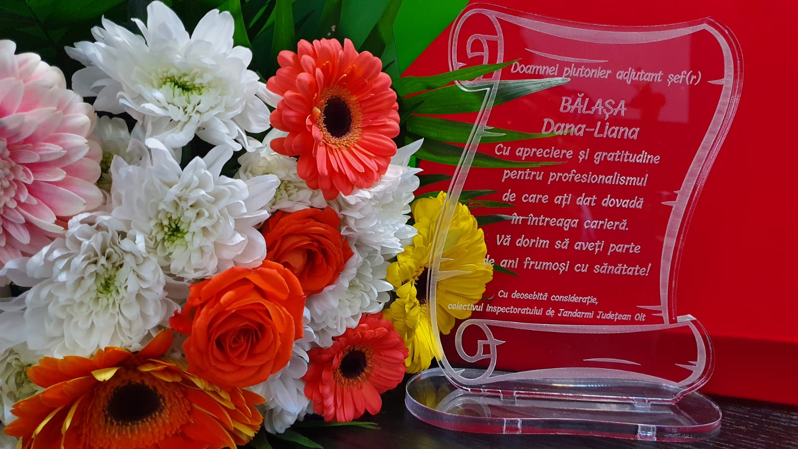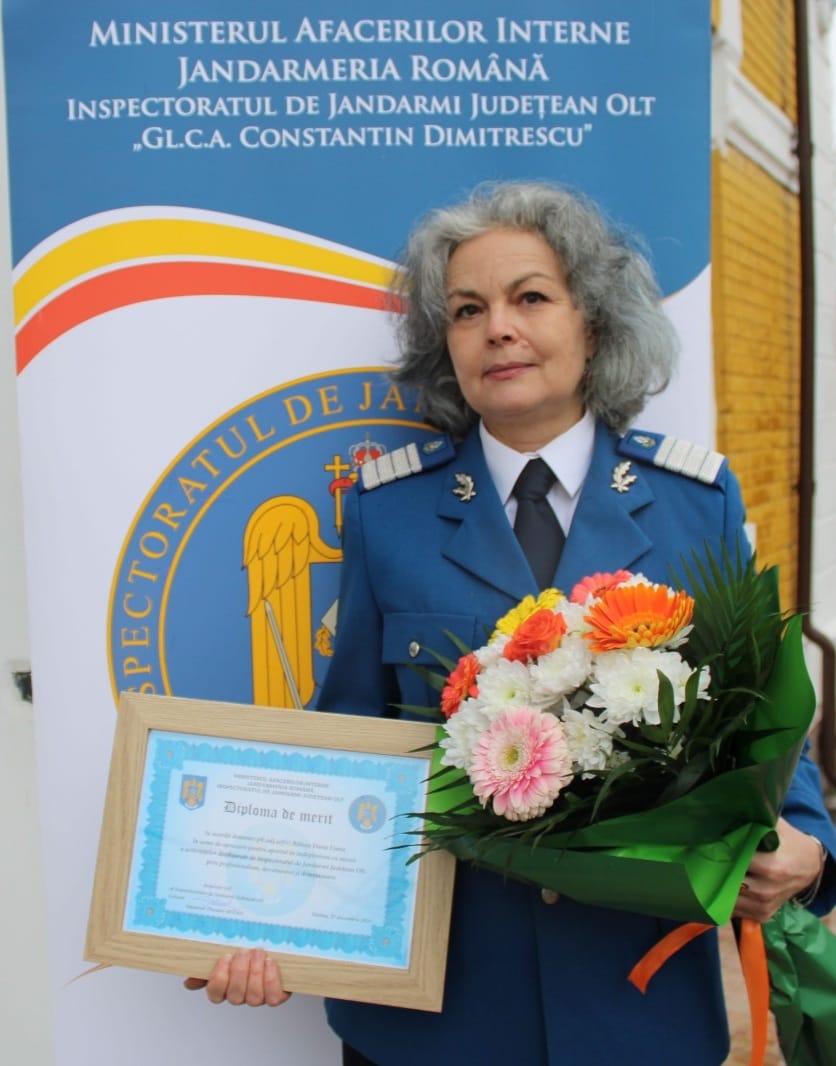Iar luni, ultima zi când a trecut pe la serviciu, jandarmii care au lucrat cu ea au ținut să-i fie alături și să-i mulțumească pentru toată activitatea, dedicația și implicarea de care a dat dovadă. Colonelul Emanuel Botan, inspectorul șef al Jandarmeriei Olt, i-a oferit Diploma de merit și toată aprecierea pentru întreaga activitate, într-un cadru restrâns, în prezența colegilor de serviciu. „Îi mulțumim doamnei plutonier adjutant șef în rezervă Dana Liana Bălașa pentru timpul și energia investite în toți acești ani, ii dorim viață frumoasă, sănătate și o perioadă cât mai activă de azi înainte!”, a fost mesajul transmis de aceștia.