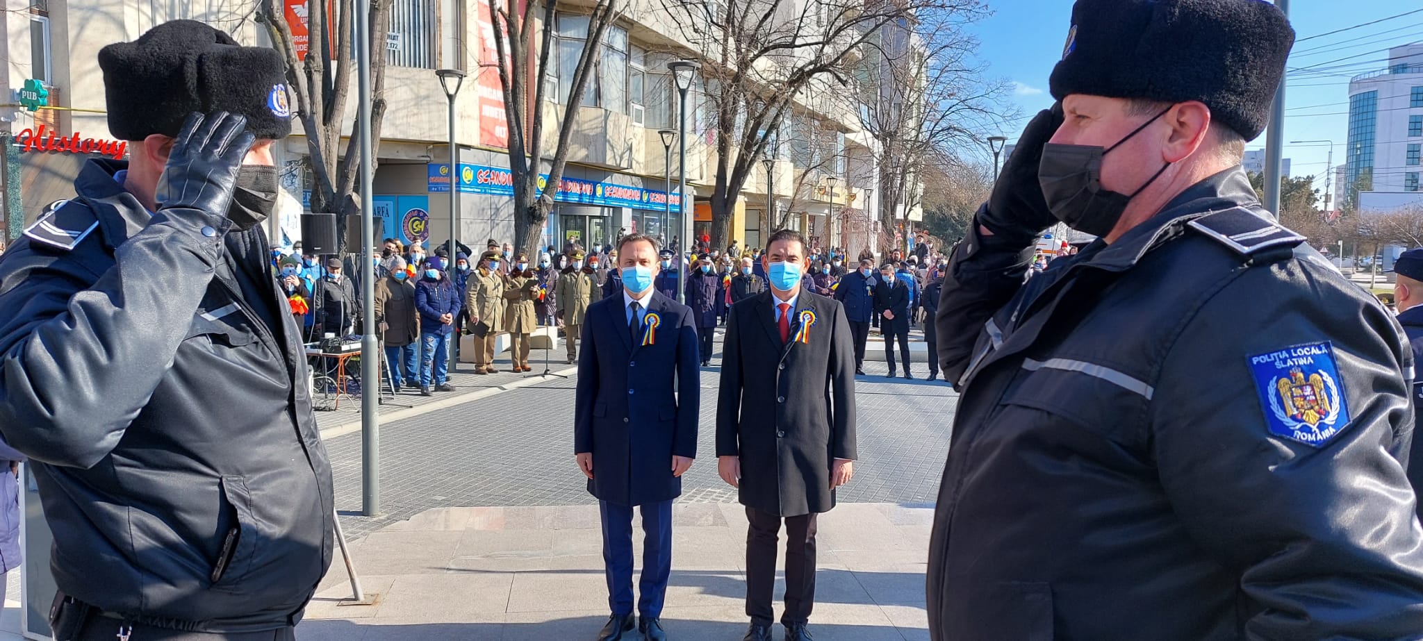 Evenimentele de la statuia Domnitorului Cuza au debutat cu distribuirea de cocarde şi steguleţe tricolore slătinenilor şi autorităţilor, moment urmat de onorul dat gărzii de onoare de prefectul de Olt. După slujba ţinută de un sobor de preoţi al Episcopiei Slatinei şi Romanaţilor, reprezentantul Guvernului în teritoriu a dat citire mesajului transmis de prim-ministrul Nicolae Ciucă cu prilejul Zilei Unirii Principatelor Române. O parte dintre cei prezenţi la manifestări au spus câteva cuvinte despre însemnătatea acestei zile, printre ei fiind și Emil Moț, primarul Slatinei: „În urmă cu 163 de ani, înaintașii noștri ne-au dat cea mai importantă lecție de solidaritate: Unirea Principatelor Române sub conducerea unui domnitor român, Alexandru Ioan Cuza. Astăzi (luni n.r.), am fost onorat să particip la ceremonia de depunere a coroanelor în semn de respect și cinste aduse celor ce au contribuit la înfăptuirea Unirii Principatelor Române. Astfel, ceremonia de omagiere a înaintașilor noștri, desfășurată la statuia domnitorului Alexandru Ioan Cuza cu prilejul împlinirii a 163 de ani de la «Mica Unire» a devenit și un simbol al credinței că ducem mai departe cu mândrie idealurile strămoșilor noștri. La mulți ani, România! La mulți ani, dragi români de pretutindeni!”.
