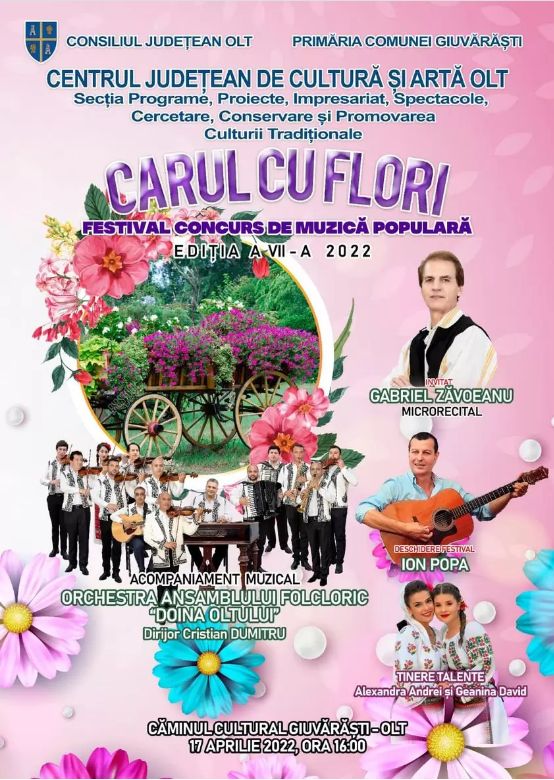 Centrul Județean de Cultură și Artă din cadrul Consiliului Județean Olt, prin Secția Programe, Proiecte, Impresariat, Spectacole, Cercetare, Conservarea și Promovarea Culturii Tradiționale, în parteneriat cu Primăria și Consiliul Local Giuvărăști, organizează în data de 17 aprilie, Ziua Floriilor, cea de-a șaptea ediție a Festivalului-concurs de muzică populară „Carul cu flori”.