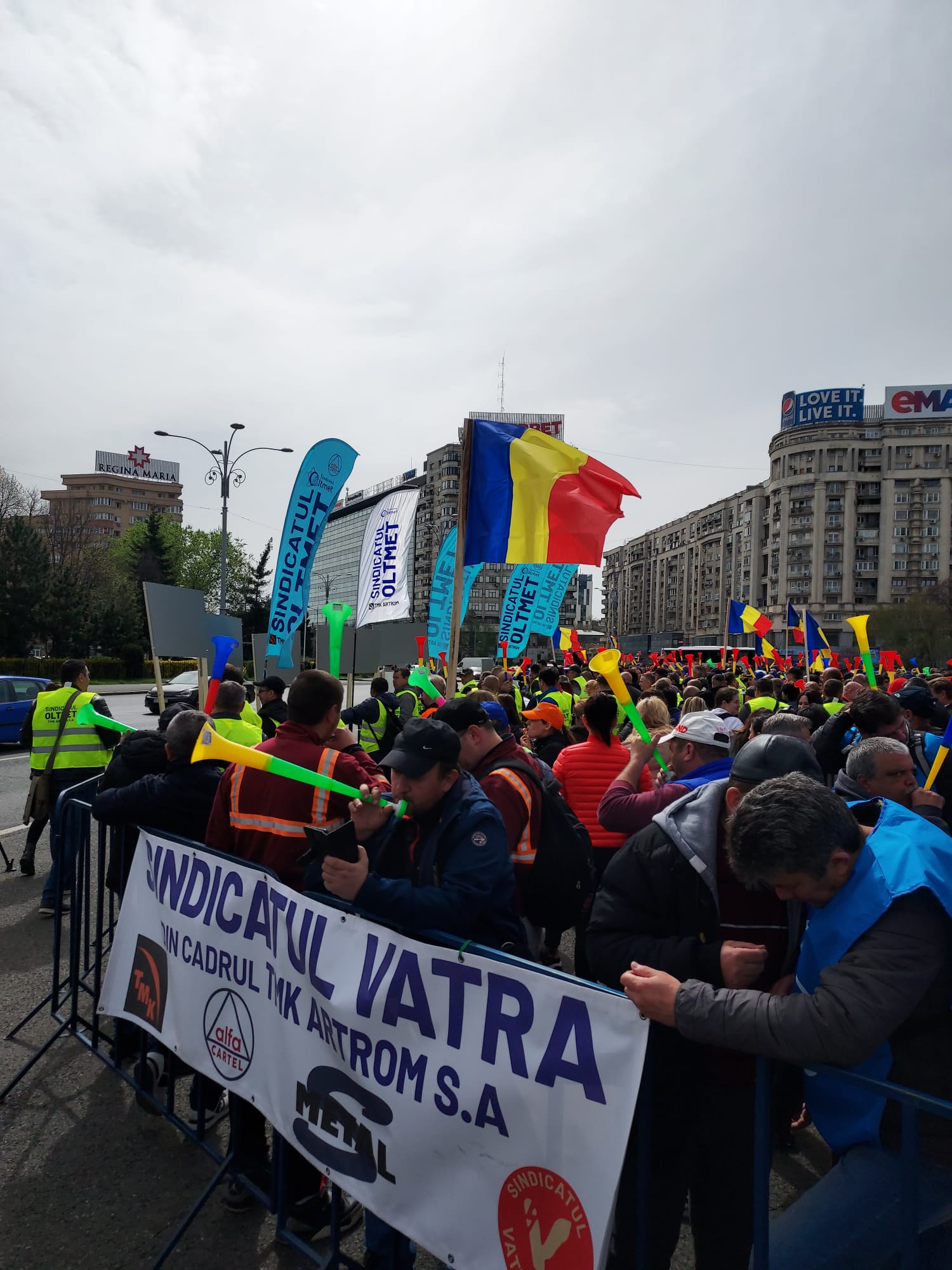Platoul din fața Guvernului României a fost locul în care joi 500 de muncitori ai societății TMK Artrom de la Slatina și Reșița, dar și alți sindicaliști din țară care au ținut să le fie alături, au protestat, nemulțumirile acestora fiind că autoritățile nu au deblocat situația fabricii, care acum este în impas. Slătinenii vor să-și păstreze locurile de muncă ca să poată să-și câștige singuri pâinea, nu să cerșească și să aștepte ajutor de la stat. De aceea, cu toții au strigat în cor „Vrem să muncim, nu să cerșim!”.