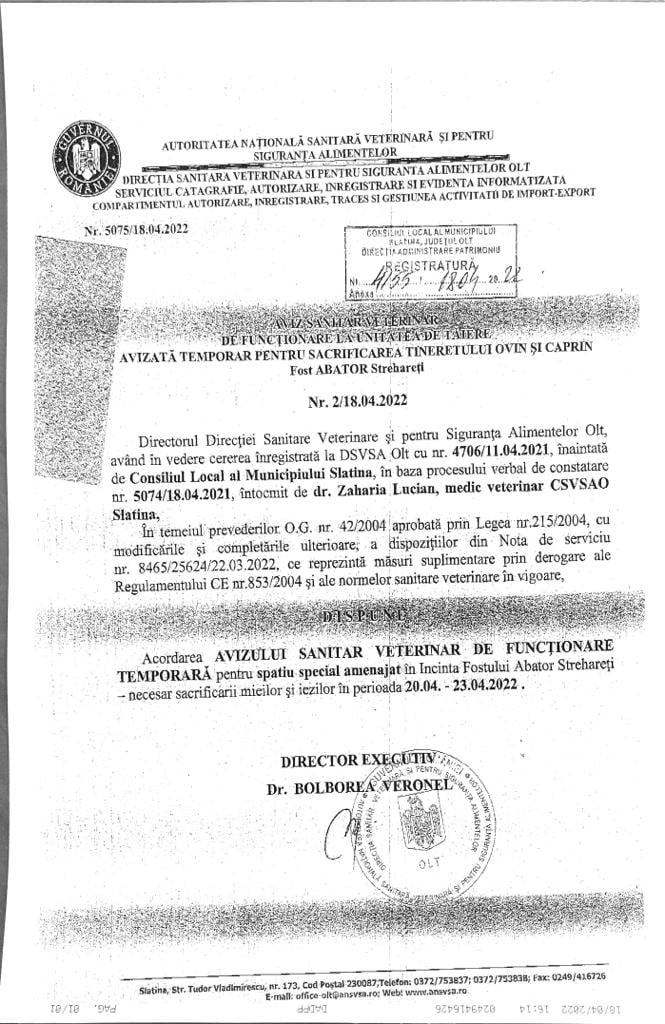 „Conform Dispoziției ce face referire la acordarea avizului sanitar veterinar de funcționare temporară pentru spațiul amenajat în incinta fostului abator Strehareți, vă aducem la cunoștință faptul că în perioada 20 – 23 aprilie 2022 acesta va funcționa în vederea sacrificării mieilor și iezilor”, transmit reprezentanții Primăriei Slatina.