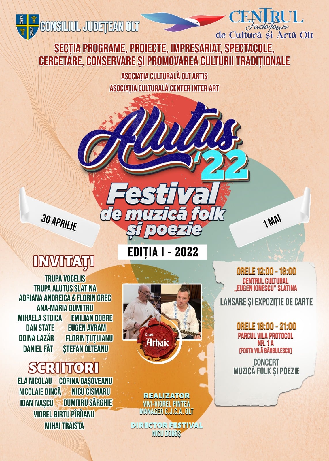 Consiliul Județean Olt, Centrul Judeţean pentru Cultură şi Artă Olt, prin Secţia Programe, Proiecte, Impresariat, Spectacole, Cercetare, Conservare şi Promovarea Culturii Tradiţionale, Asociația Culturală Olt Artis și Asociația Culturală Center Inter Art organizează sâmbătă, 30 aprilie, şi duminică, 1 mai, prima ediție a Festivalului de muzică folk și poezie „ALUTUS ‘22”.