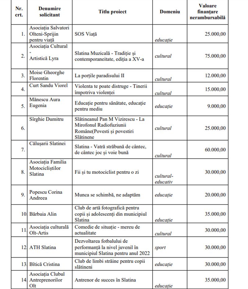 Mai multe organizații, asociații sau fundații din domeniul cultural, social, sănătate și sport vor primi și anul acesta fonduri nerambursabile din partea Primăriei Slatina. Sunt 14 proiecte de interes local care vor primi un sprijin financiar de puțin peste 430.000 de lei, cele mai mari sume fiind acordate Asociației Cultural Artistică „Lyra” – 75.000 de lei pentru proiectul cultural Slatina Muzicală – Tradiție și contemporaneitate, ediția XV, și Asociației „Călușarii Slatinei” – 60.000 de lei pentru derularea proiectului devenit deja tradiție „Slatina – Vatră străbună de cântec, joc și voie bună”. Cea mai mică sumă de bani, respectiv 9.000 de lei, va fi acordată Aurei Eugenia Mănescu pentru proiectul „Educație pentru sănătate, educație pentru mediu”.