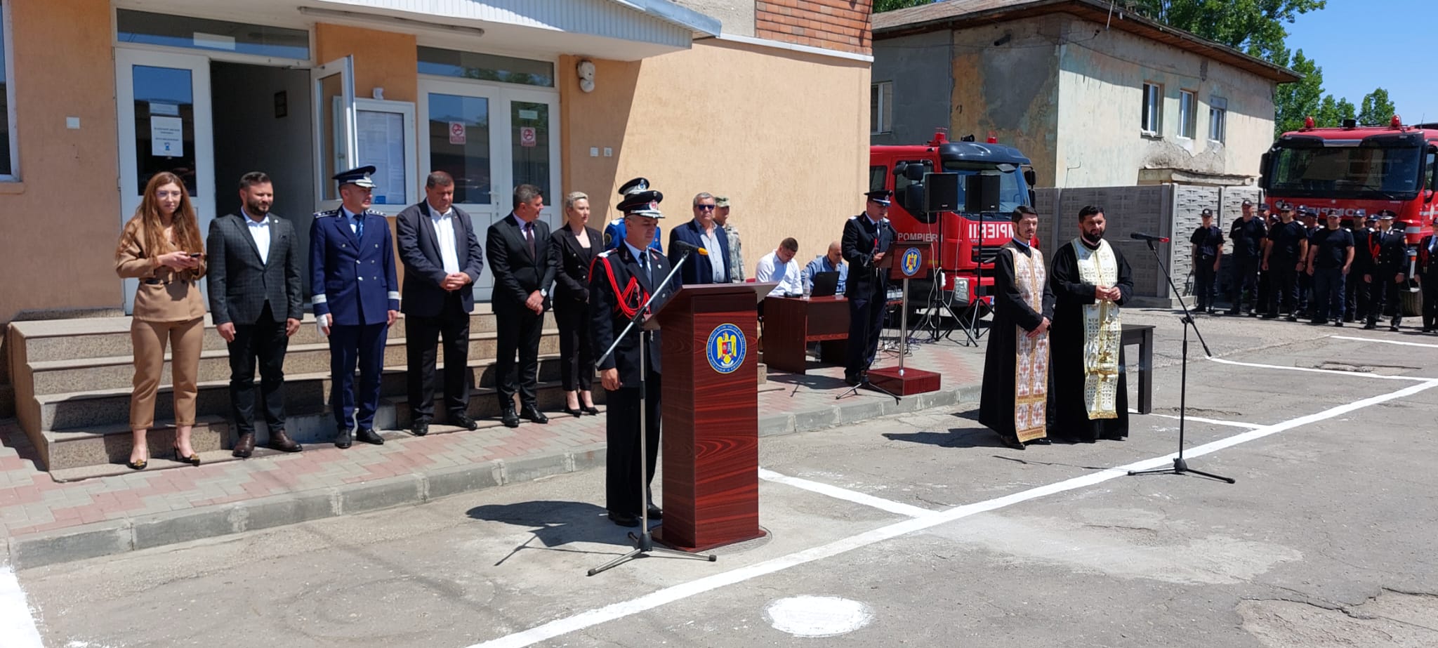 „Am organizat astăzi ceremonialul de depunere a jurământului militar pentru un număr de 14 soldați profesioniști, care au completat rândurile pompierilor. Sunt un nou corp în cadrul Inspectoratului pentru Situații de Urgență Olt, au avut o perioadă de pregătire de patru săptămâni, este prima etapă, partea teoretică militară, și urmează a doua etapă, de nouă săptămâni, unde intră în partea de specialitate. De acum sunt angajați ai ISU «Matei Basarab» al județului Olt, cei mai tineri angajați, împrospătează rândurile colegilor, au până în 25 de ani și le urez succes în activitate și activitate cât mai lungă, cu cât mai multe misiuni cu succes terminate. Sunt împărțiți la Detașamentul de Pompieri Slatina – 12 și patru la Garda de Intervenție Stoenești, acolo au fost opțiunile si locurile pentru care ei au dat examene. În total, avem 16 soldați profesioniști, toți servanți. La ISU Olt sunt în total în jurul cifrei a 740 de cadre, undeva o proporție de 90% încadrare, deci am mai avea nevoie de personal”, a declarat colonelul Adrian Tănase, inspectorul șef al ISU Olt.