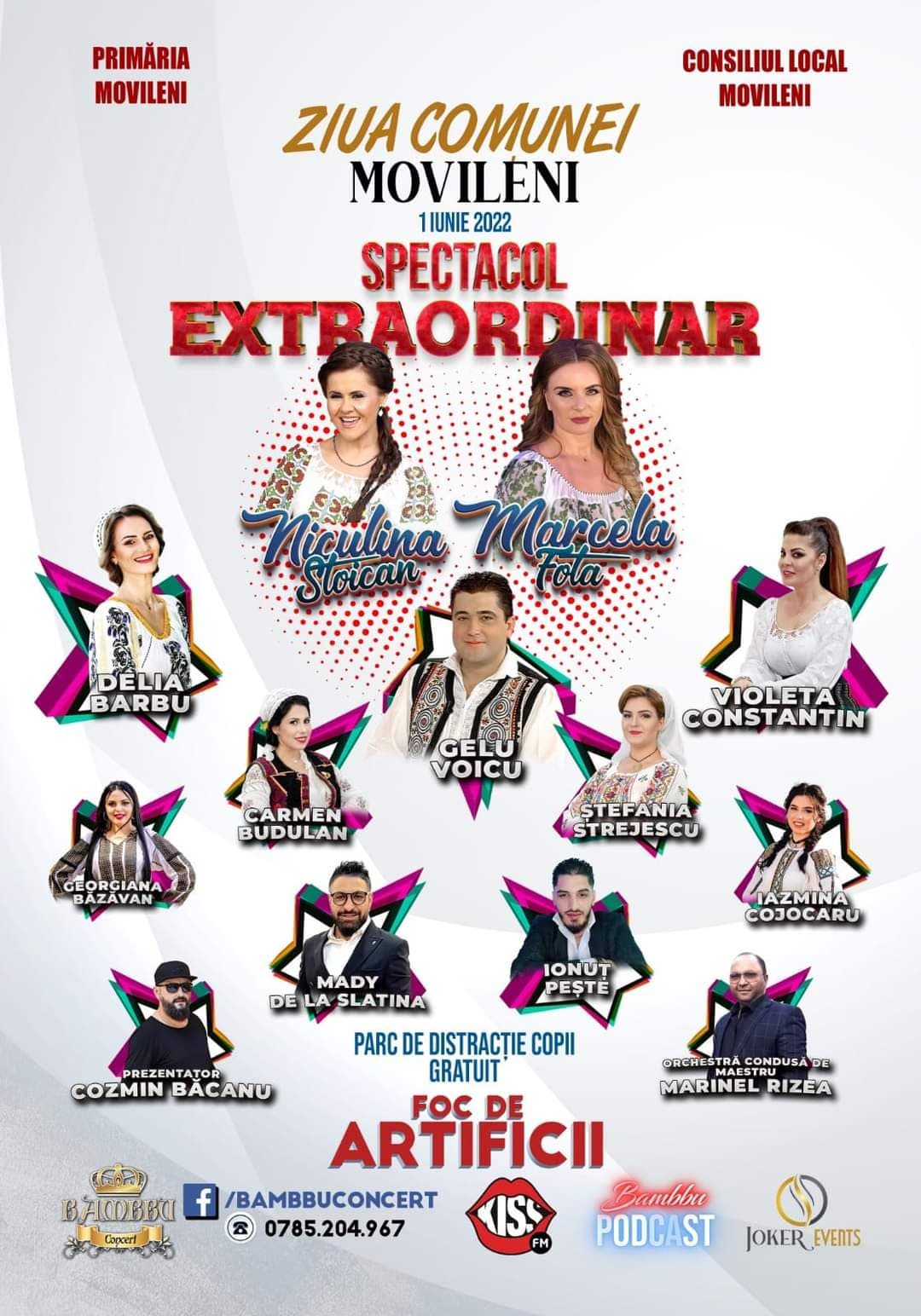 Movilenii vor avea un dublu motiv de sărbătoare de 1 Iunie. Pe lângă Ziua Copilului, este și Ziua Comunei, motiv pentru care Primăria și Consiliul Local Movileni, împreună cu Ion Sorin Toma, edilul localității, au pregătit un spectacol extraordinar în care vor evolua îndrăgiți interpreți ai muzicii populare românești, și nu numai.