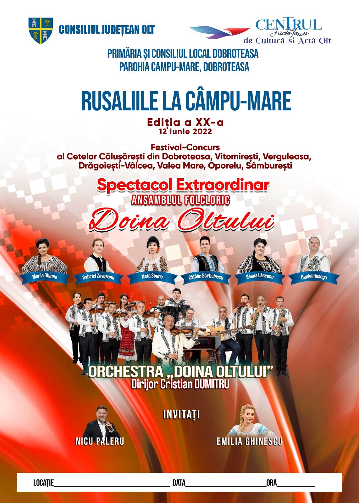 Festivalul concurs al cetelor călușărești din satul Câmpu Mare al comunei Dobroteasa este reluat anul acesta, după o absență de doi ani din cauza pandemiei COVID-19, ajungând la cea de-a XX-a ediție. Evenimentul este programat a avea loc în prima zi de Rusalii, 12 iunie, în intervalul orar 11:00 – 15:00, în Târgul săptămânal din localitate, iar cap de afiș ai spectacolului vor fi îndrăgiții interpreți Emilia Ghinescu și Nicu Paleru.