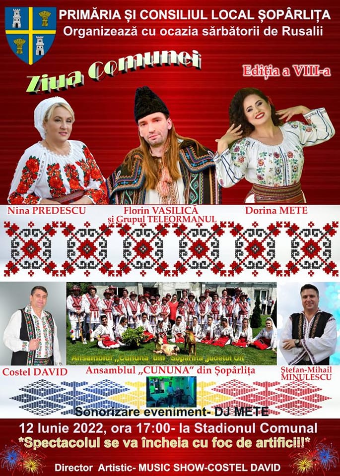 Locuitorii comunei Șopârlița vor îmbrăca haine de sărbătoare peste o săptămână, în Duminica Rusaliilor aici fiind programat a se desfășura o manifestare dedicată Zilei localității, precum și tradiționalul concurs de cai. Cap de afiș al spectacolului este nimeni altul decât îndrăgitul interpret de muzică populară Florin Vasilică și grupul său Teleormanul.