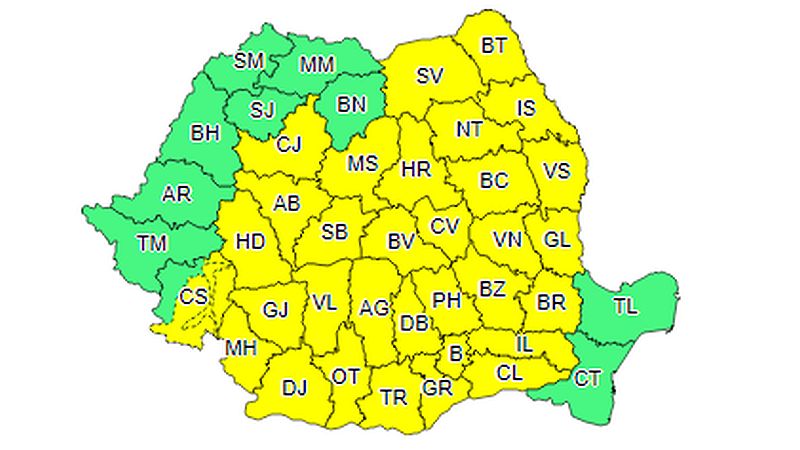 Codul galben a intrat în vigoare de duminică, la ora 10:00, fenomenele anunțate fiind ploi torențiale, cu descărcări electrice, vânt puternic și pe alocuri vijelii și grindină.