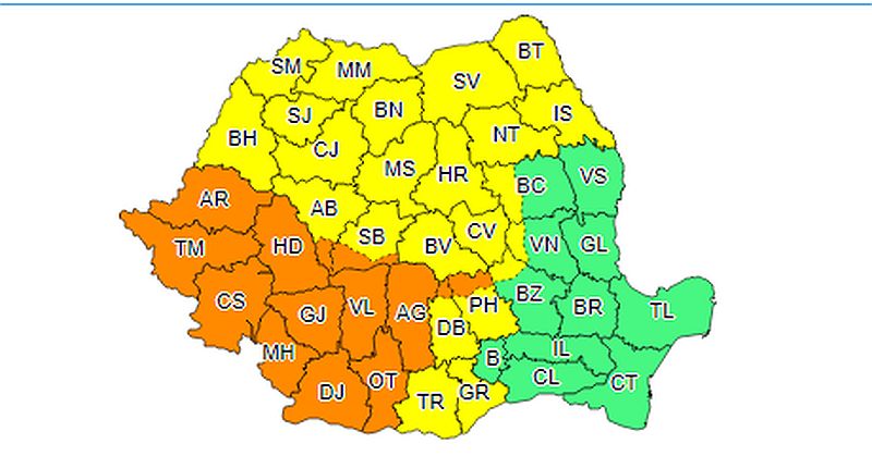 „În după-amiaza zilei de astăzi, 5 iulie, local în Oltenia, în nordul Munteniei și în Carpații Meridionali, apoi și în Banat, sudul Crișanei și sud-vestul Transilvaniei, vor fi averse torențiale, vijelii – rafale de peste 70…80 km/h și izolat 90 km/h și grindină. În intervale scurte de timp sau prin acumulare cantitățile de apă vor depăși local 35…40 și pe arii restrânse 50…60 l/mp”, transmit reprezentanții Administrației Naționale de Meteorologie.
