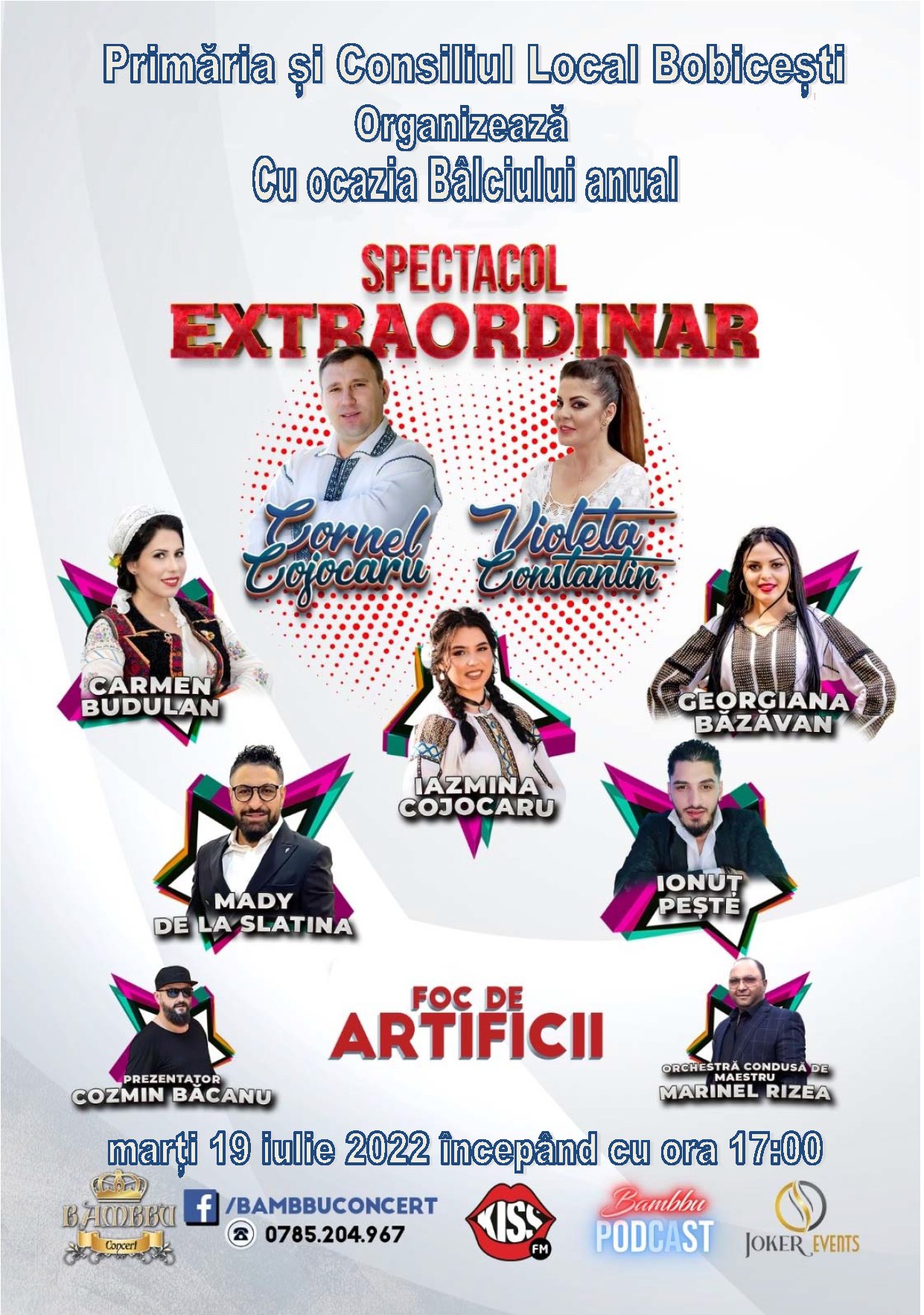 Locuitorii din Bobicești îmbracă haine de sărbătoare marți, 19 iulie, când în comună, cu începere de la ora 17:00, va avea loc bâlciul anual. Cu această ocazie, Primăria și Consiliul Local Bobicești, în frunte cu primarul Ilie Chitez, organizează un spectacol extraordinar, cap de afiș fiind îndrăgiții interpreți de muzică populară Violeta Constantin (foto n.r,), Cornel Cojocaru și Iazmina Cojocaru.