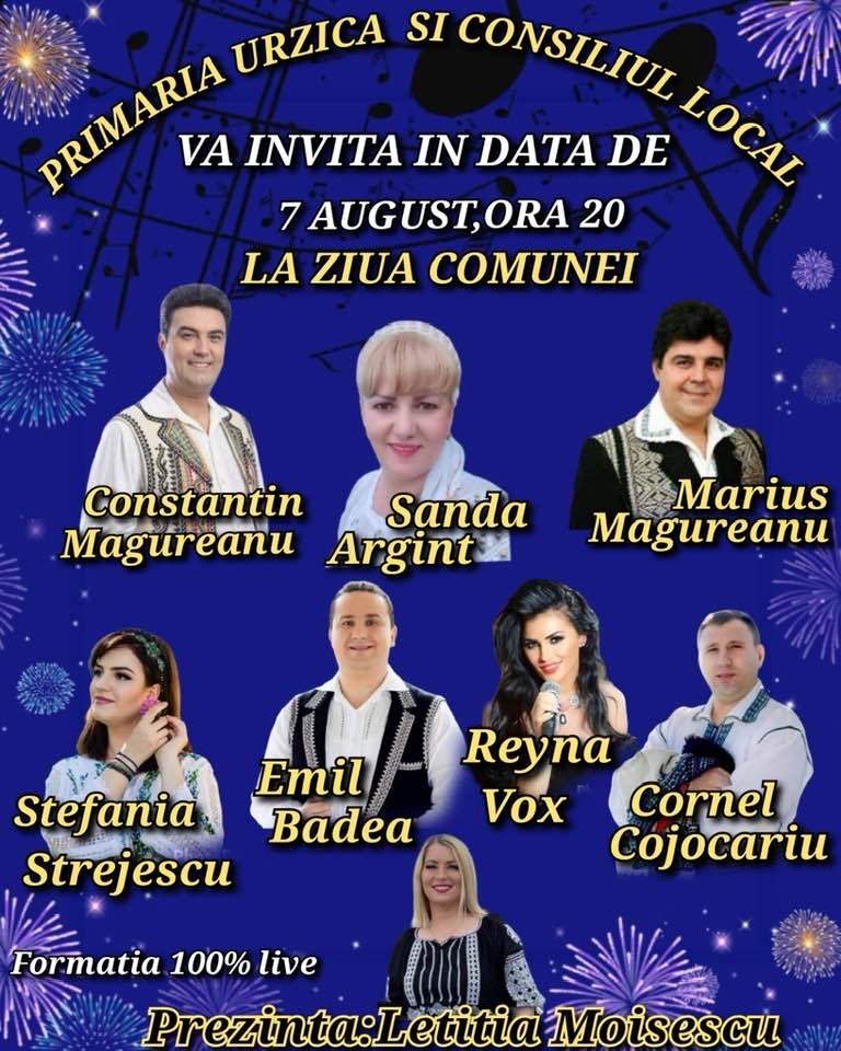 Prilej de sărbătoare duminică, 7 august, pentru locuitorii din comuna Urzica. Este ziua localității, iar cu acest prilej Primăria și Consiliul Local, împreună cu edilul Ion Spiridon, au pregătit o manifestare cultural artistică în cadrul căreia vor cânta mai mulți interpreți de muzică populară și ușoară, printre aceștia fiind Constantin Măguranu, Sanda Argint și Marius Măgureanu.