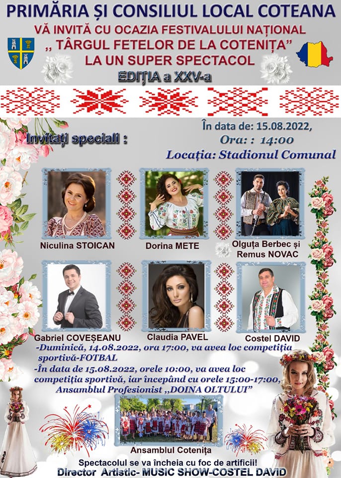 Festivalul Național „Târgul fetelor de la Cotenița” a ajuns anul acesta la cea de-a 25-a ediție, iar cu această ocazie Primăria și Consiliul Local Coteana, în frunte cu edilul Ionuț Dima, au pregătit multe surprize pentru cetățenii din comună. Evenimentul cultural artistic va fi organizat ca de fiecare dată de Sfânta Maria Mare, pe stadionul comunal, iar primele manifestări, care vor fi unele sportive, au loc chiar cu o zi înainte. Însă, marele spectacol va fi în ziua de 15 august, iar printre artiștii care vor cânta pe scena de pe stadion se numără Niculina Stoican, Olguța Berbec și Remus Novac și Claudia Pavel.