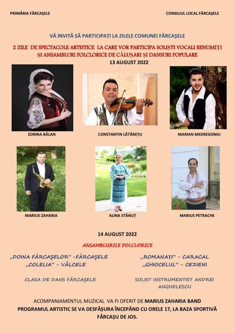 Cei doi artiști, alături de Constantin Lătărețu, Marius Zaharia, Alina Stănuț și Marius Petrache, vor cânta sâmbătă, iar duminică în fața publicului spectator vor evolua ansamblurile folclorice „Doina Fărcașelor” din Fărcașele, „Romanați” din Caracal, „Colelia” din Vâlcele, „Ghiocelul” din Cezieni, clasa de dans Fărcașele și solistul instrumentist Andrei Anghelescu, în cele două zile de spectacol acompaniamentyul muzical fiind asigurat de Marius Zaharia Band.