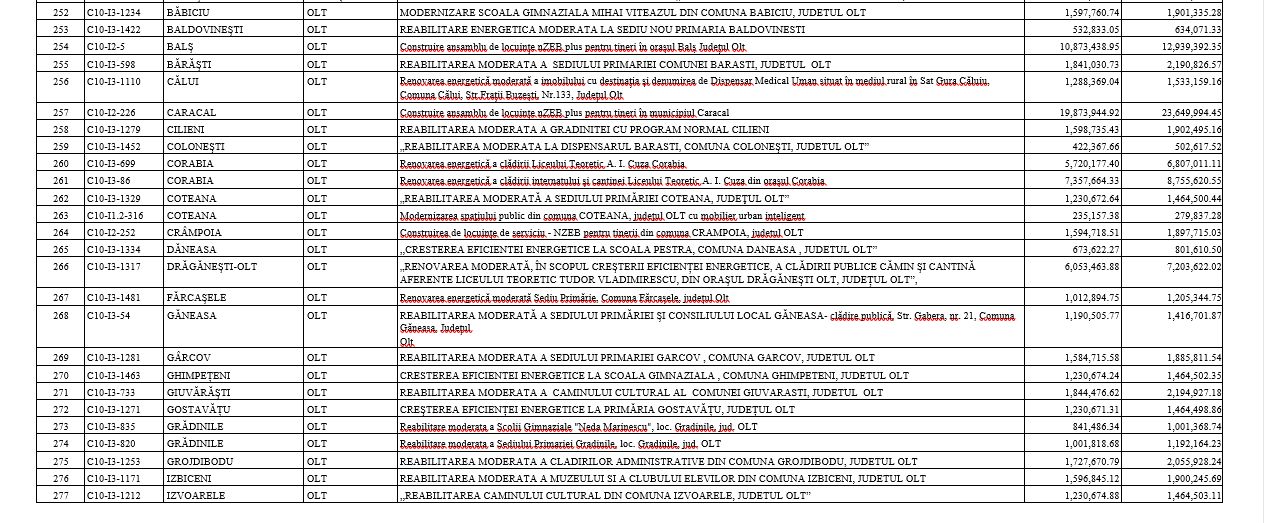 Iar din totalul de 65 de proiecte, cea mai mare valoare este pentru cel de Construire ansamblu de locuințe nZEB plus pentru tineri, în municipiul Caracal – 23,649,994.45 lei, cea mai mică valoare, de 279,837.28 lei, fiind alocată pentru Modernizarea spaţiului public din comuna Coteana cu mobilier urban inteligent.
