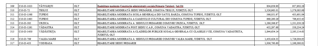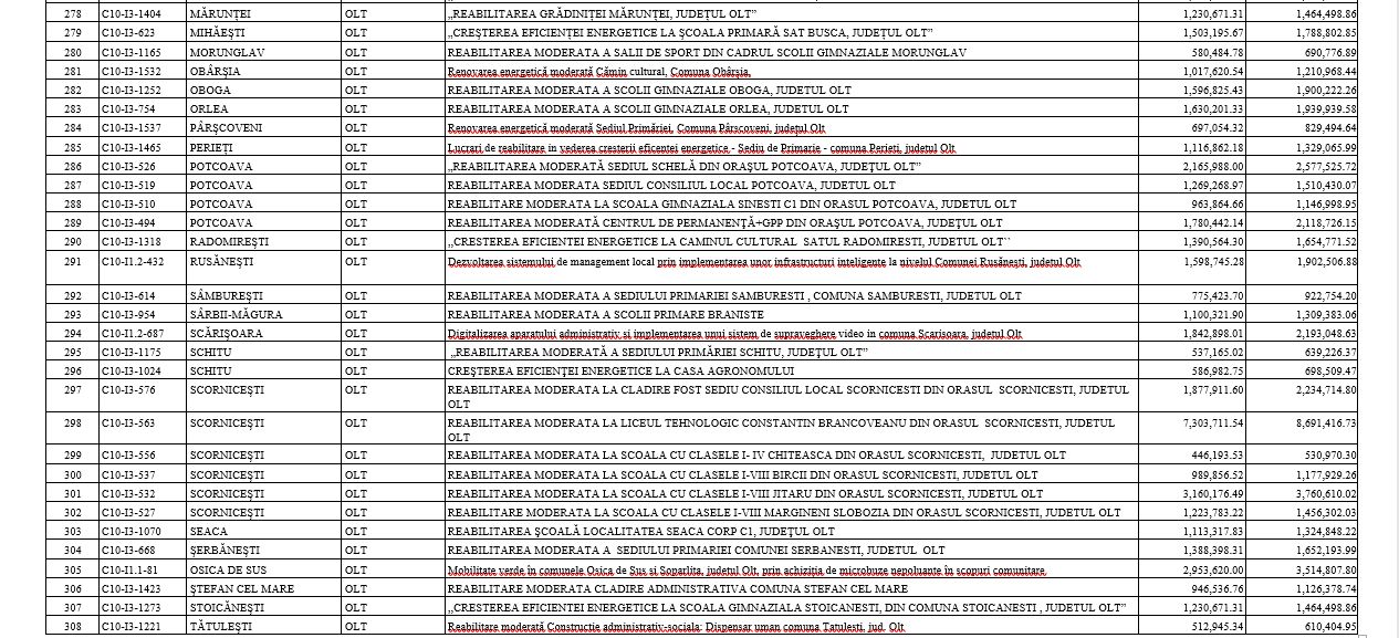 Proiectele au fost depuse în cadrul primei runde de atragere de fonduri pe componentele Valul Renovării și Fondul Local din PNRR, cele din Olt fiind realizate cu buget de la Fondul Local.
