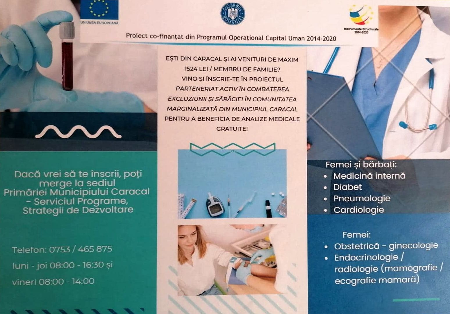 „Eşti din Caracal şi ai venituri de maxim 1.524 lei/membru de familie. Poți beneficia de analize medicale gratuite printr-un Proiect co-finanțat din Programul Operațional Capital Uman 2014-2020. Specializările medicale vizate pentru femei și bărbați sunt: Cardiologie, Pneumologie, Medicină Internă, Diabet. Totodată, femeile pot beneficia de analize gratuite la Obstetrică – Ginecologie, Endocrinologie, Radiologie (Mamografie). Dacă vrei să te înscrii poți să o faci la sediul Primăriei Caracal – Serviciul de Programare, Strategii de Dezvoltare. Informații suplimentare: 0753/465.875, de luni până joi între orele 08:00 – 16:30 și vineri între orele 08:00 – 14:00”, se precizează într-un comunicat remis de reprezentanții Primăriei Caracal și făcut public pe pagina oficială de Fecebook.