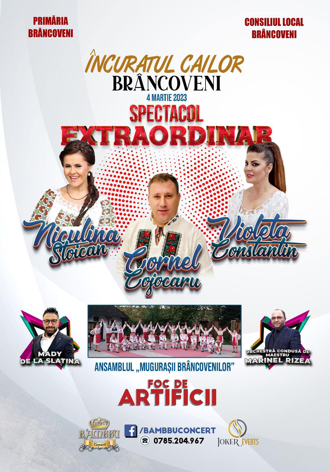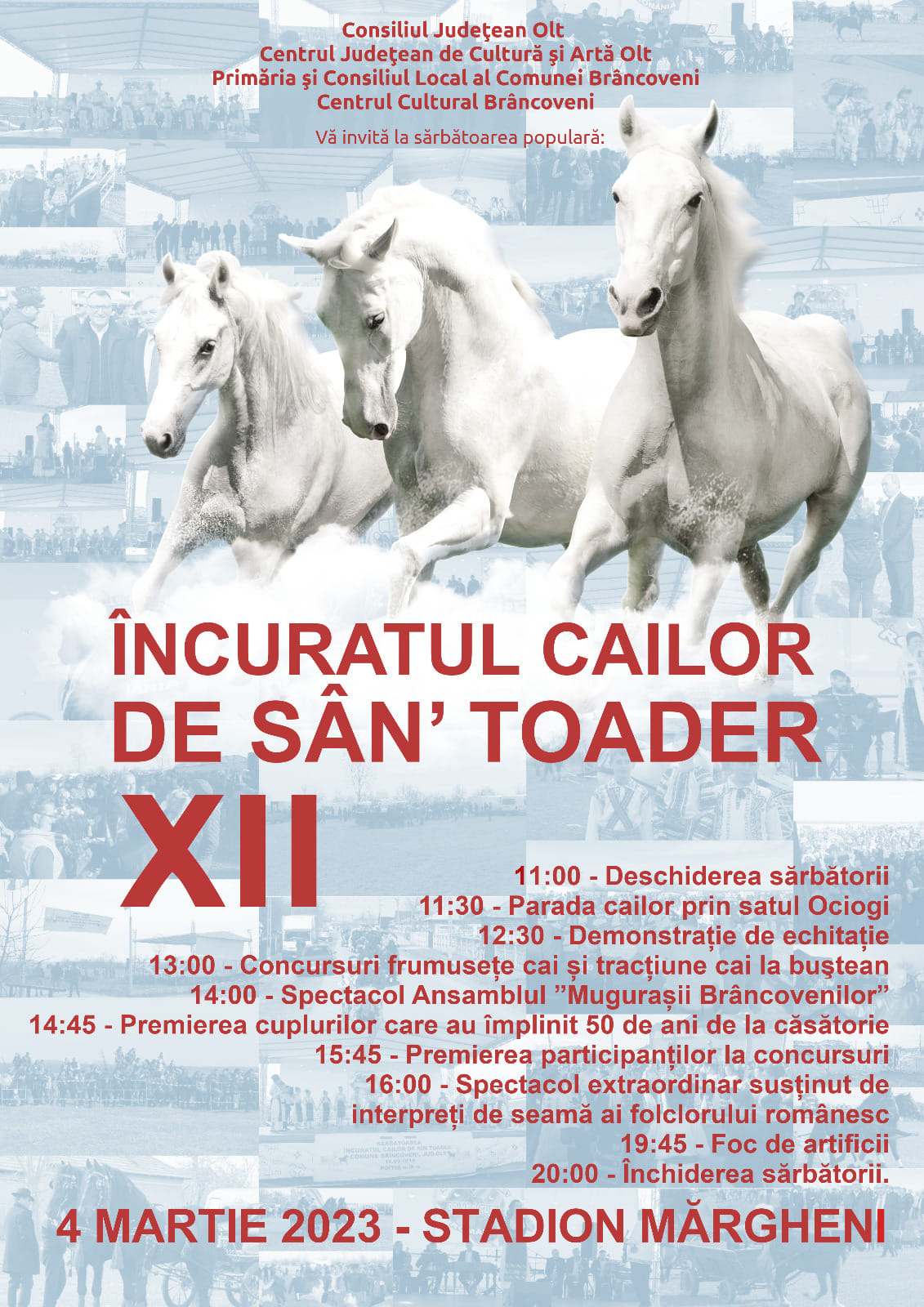 Mai sunt doar câteva zile până când la Brâncoveni va avea loc sărbătoarea populară „Încuratul cailor de Sân’ Toader”, ajunsă anul acesta la cea de-a XII-a ediție. Organizatori vor fi și în anul 2023 Consiliul Județean Olt, Centrul Județean de Cultură și Artă Olt, Primăria și Consiliul Local Brâncoveni și Centrul Cultural Brâncoveni, însă pe lângă concursul propriu-zis în urma căruia vor fi acordate premii proprietarilor celor mai frumoși și puternici armăsari, autoritățile locale au pregătit și alte suprize. Cele mai mare dintre ele sunt acordarea de premii cuplurilor care au împlinit 50 de ani de căsnicie, un concert în cadrul căreia susțin recitaluri cunoscuți și îndrăgiți interpreți de muzică populară, precum Niculina Stoican, Violeta Constantin și Cornel Cojocaru, și un grandios foc de artificii.