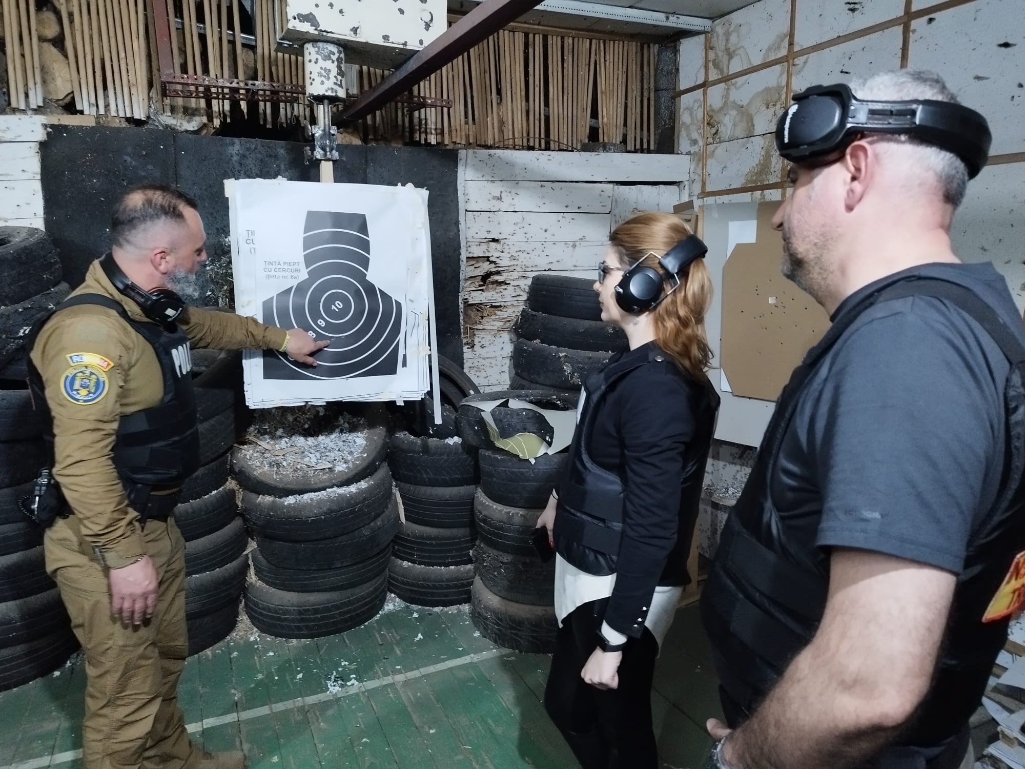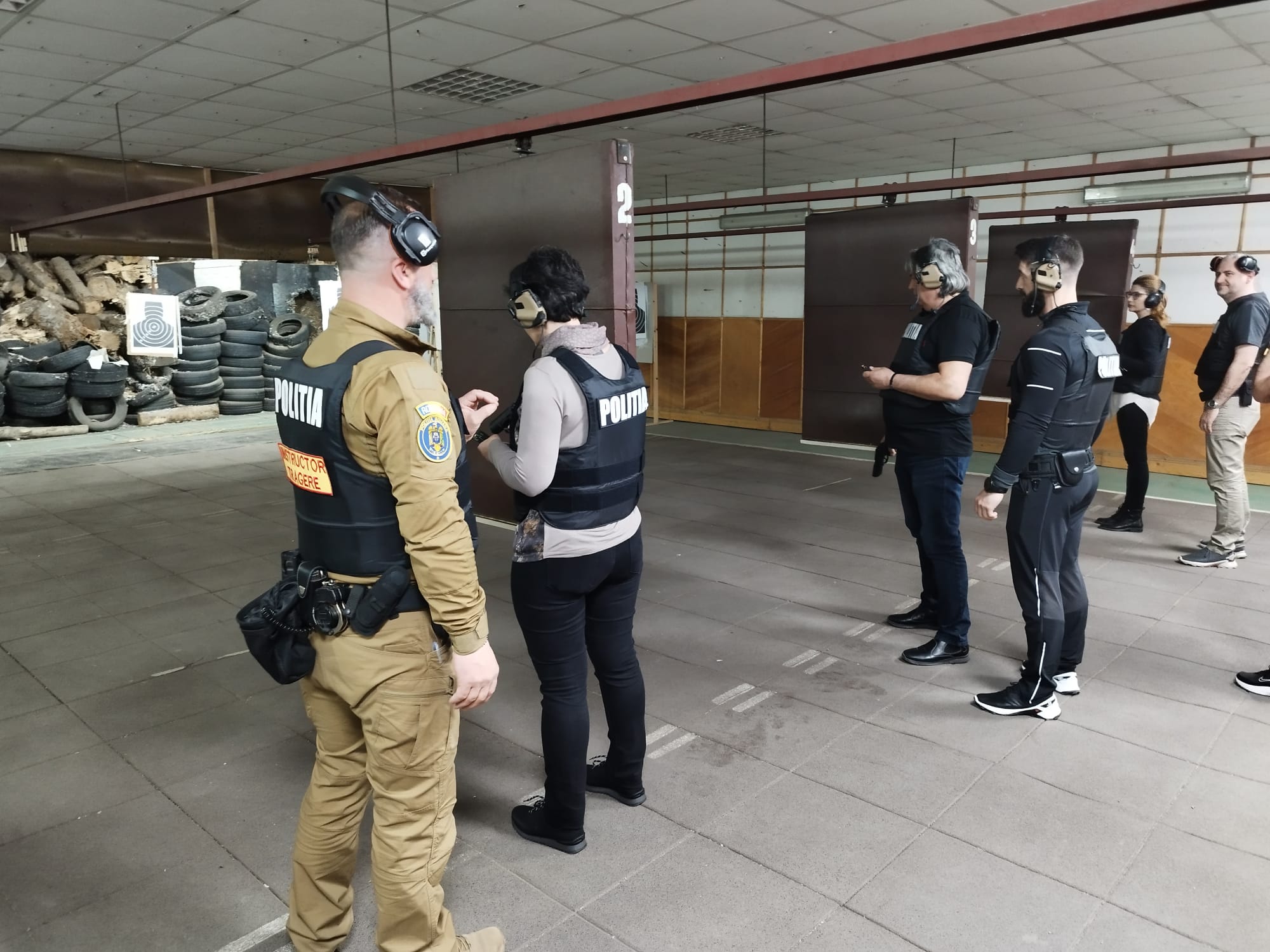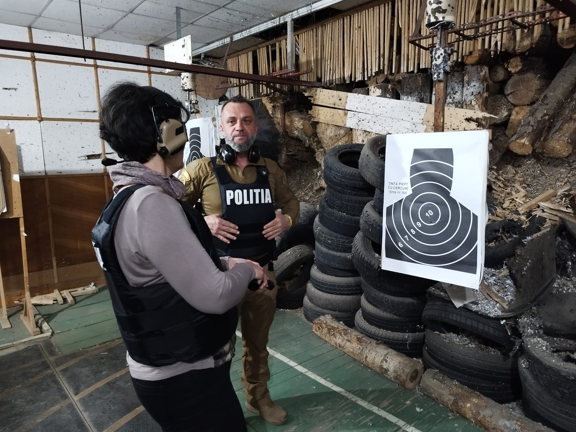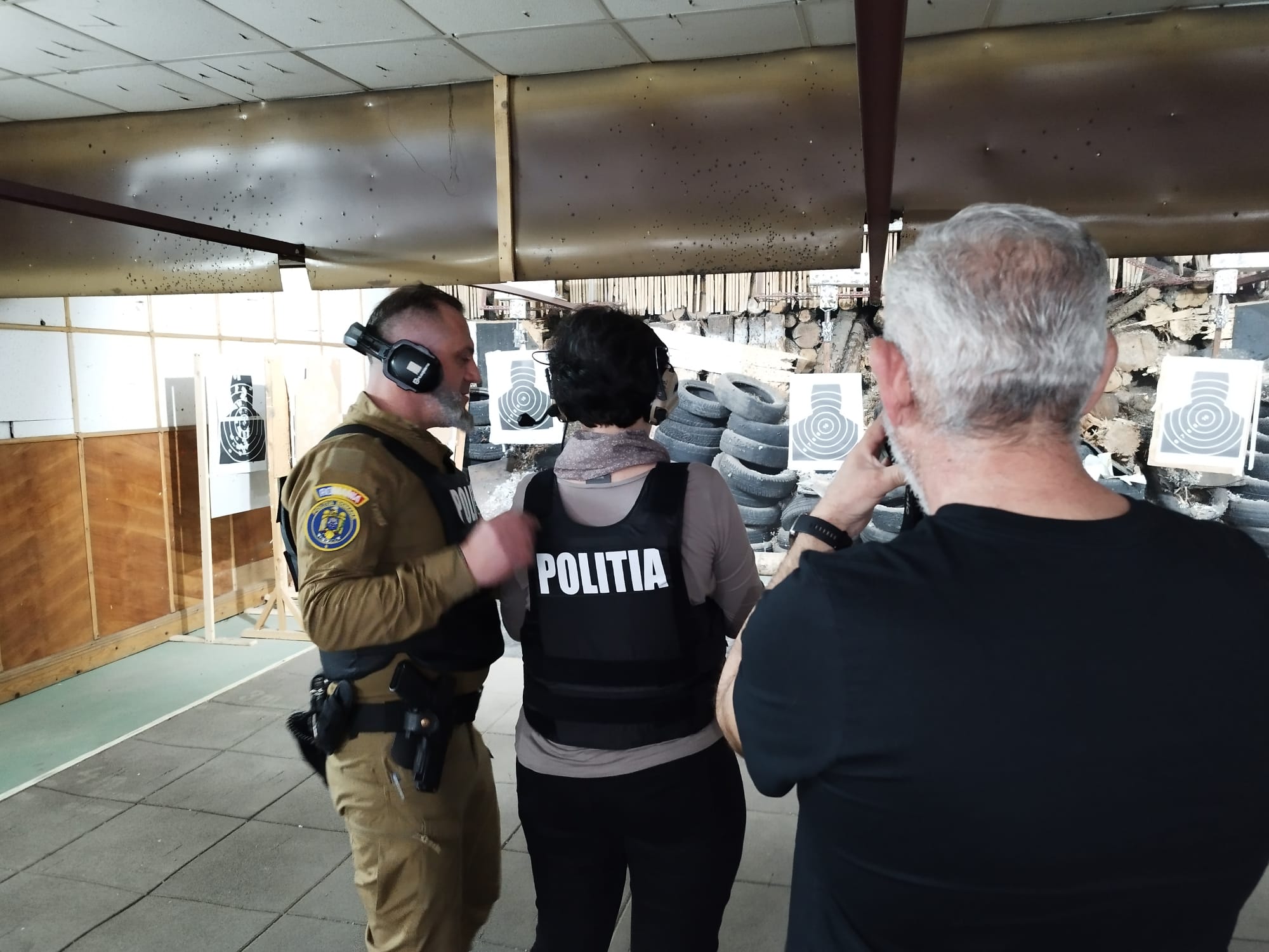 Obișnuiți de la alte activități de acest gen să tragă cu pistolul Carpați, de calibru 7,65 milimetri, pentru majoritatea jurnaliștilor a fost o noutate să tragă la ținta piept cu cercuri cu un pistol Beretta. Mergând apoi în poligonul de tragere și costumați cu veste antiglonț, au fost efectuate mai întâi două trageri de încălzire și familiarizare cu armamentul din dotarea polițiștilor olteni, de la distanța de 5, respectiv 10 metri, fiecare dintre participanți având la dispoziție de fiecare dată câte cinci cartușe.