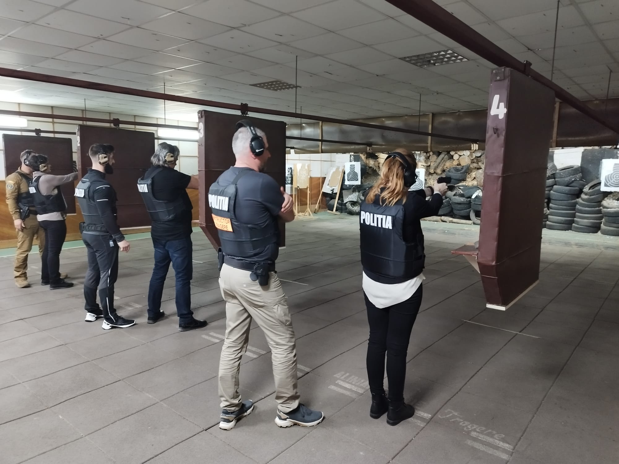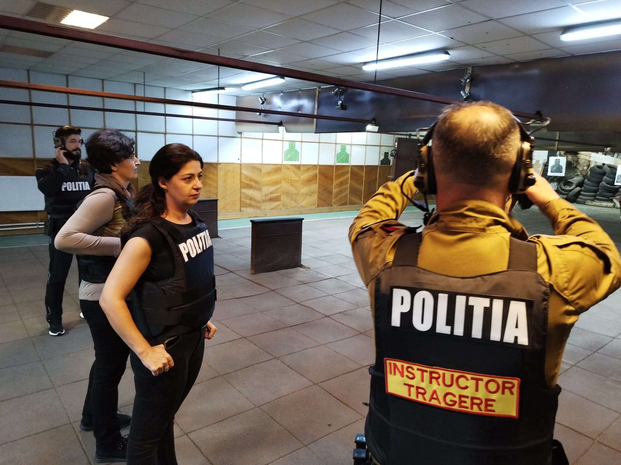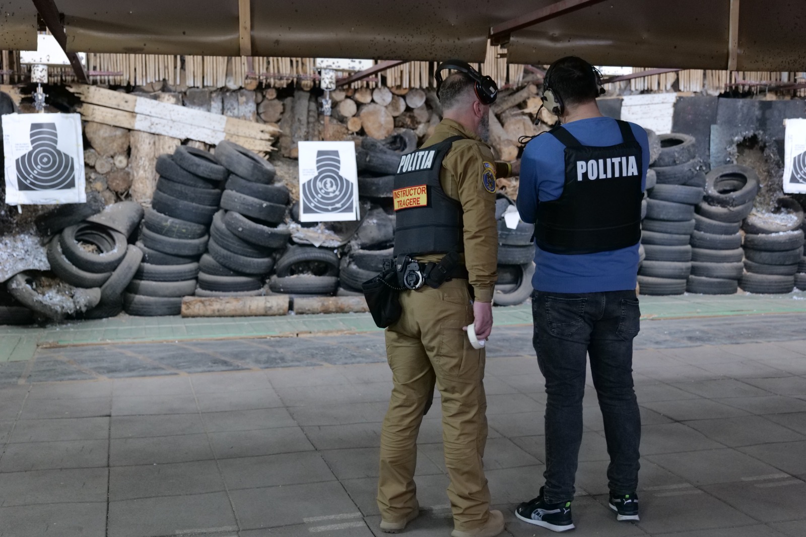 Obișnuiți de la alte activități de acest gen să tragă cu pistolul Carpați, de calibru 7,65 milimetri, pentru majoritatea jurnaliștilor a fost o noutate să tragă la ținta piept cu cercuri cu un pistol Beretta. Mergând apoi în poligonul de tragere și costumați cu veste antiglonț, au fost efectuate mai întâi două trageri de încălzire și familiarizare cu armamentul din dotarea polițiștilor olteni, de la distanța de 5, respectiv 10 metri, fiecare dintre participanți având la dispoziție de fiecare dată câte cinci cartușe.