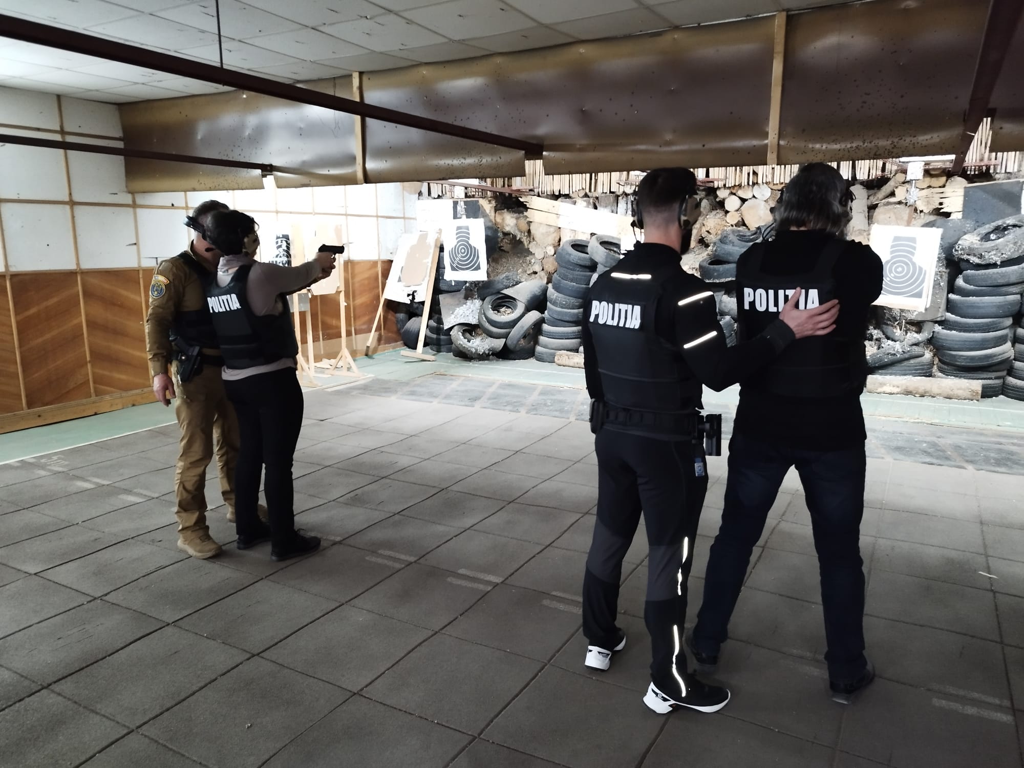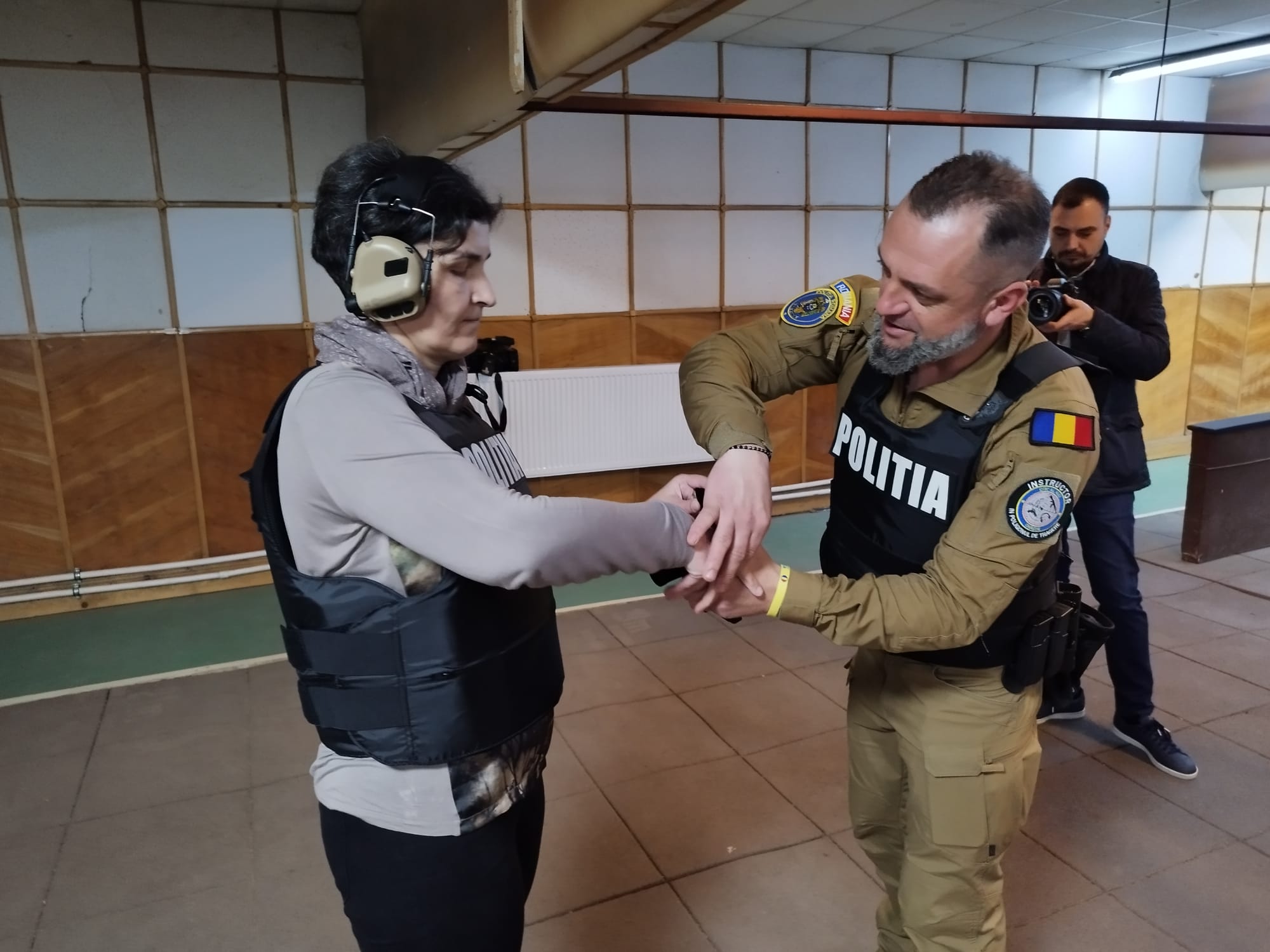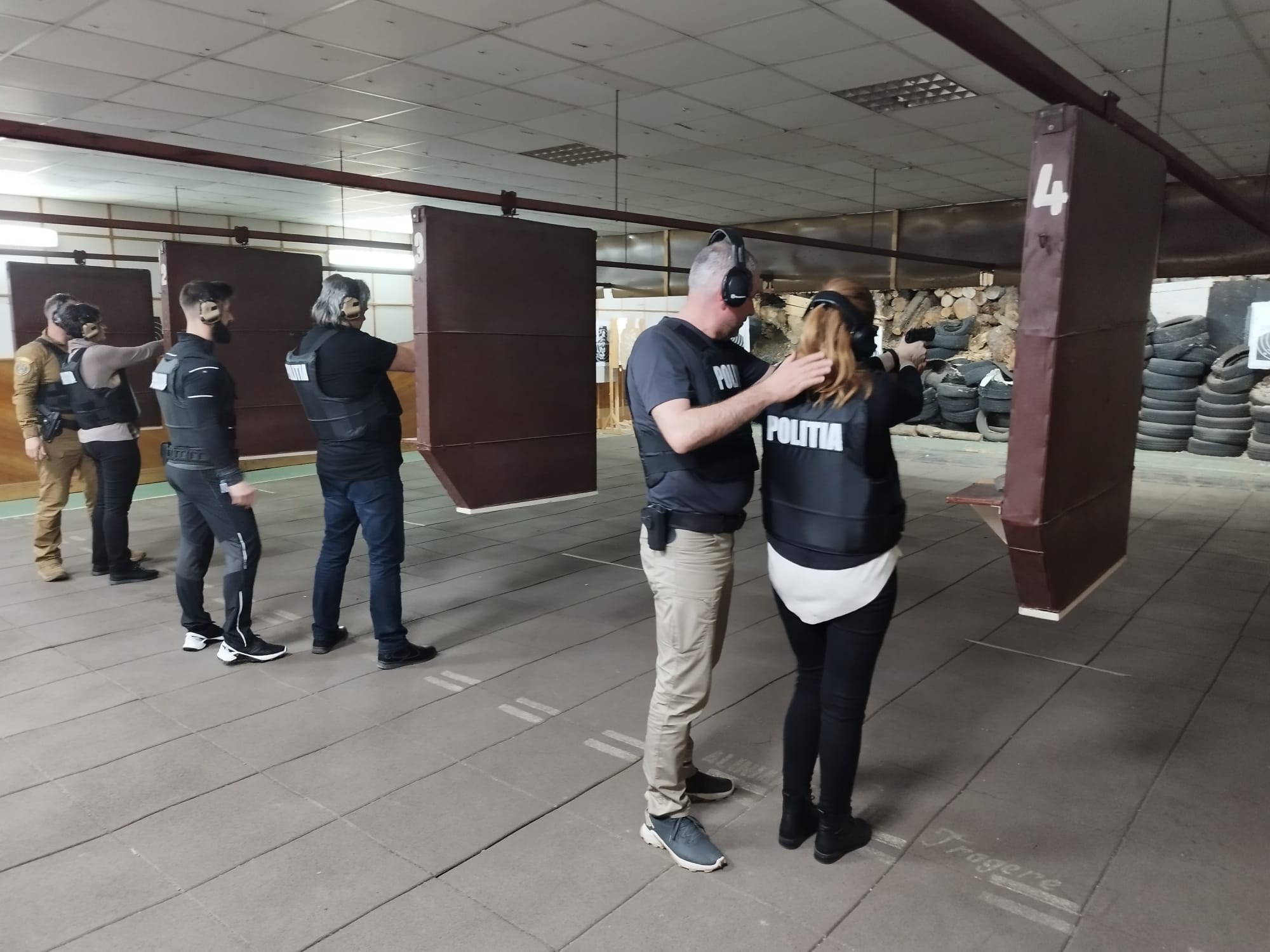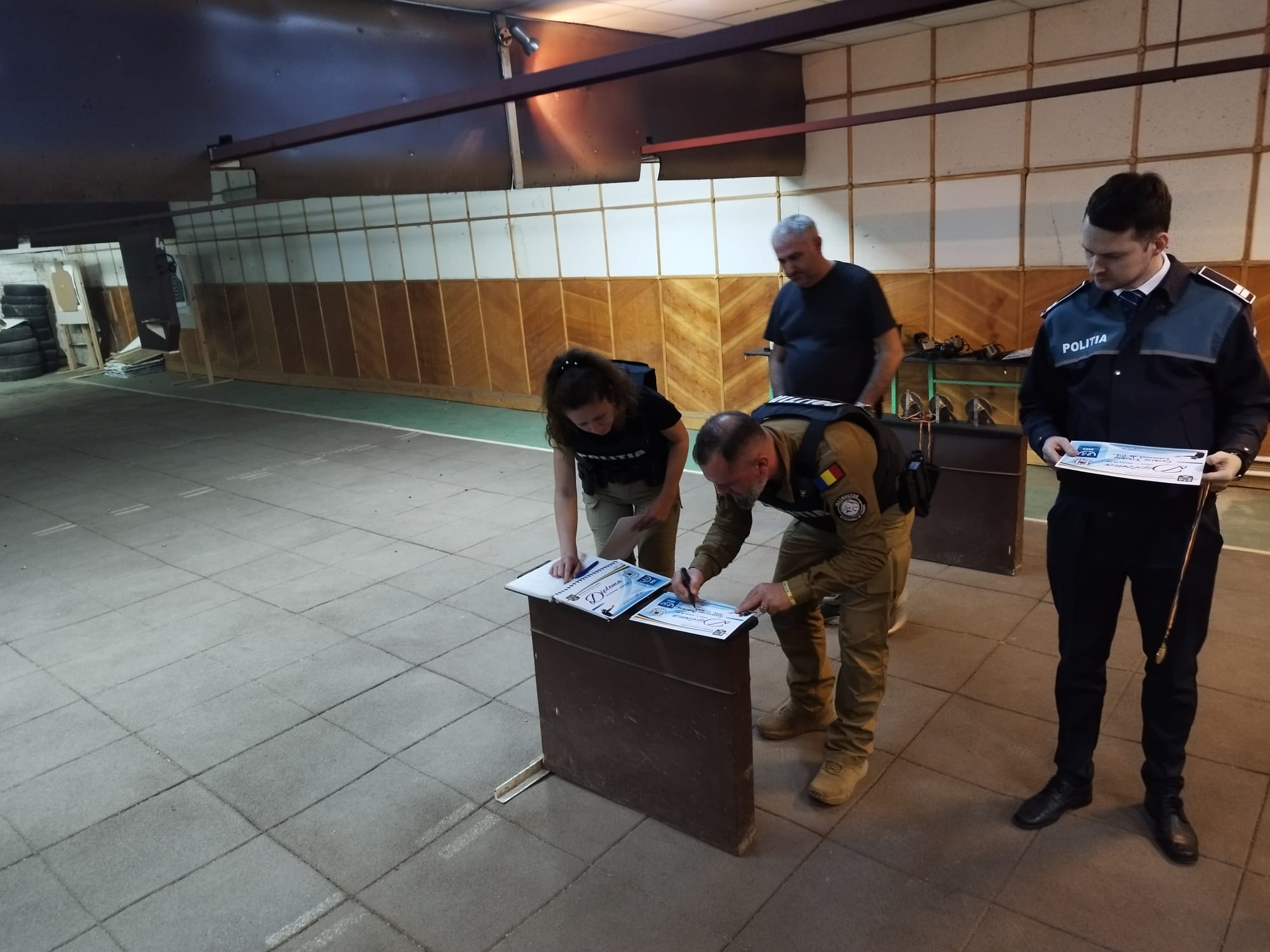 Obișnuiți de la alte activități de acest gen să tragă cu pistolul Carpați, de calibru 7,65 milimetri, pentru majoritatea jurnaliștilor a fost o noutate să tragă la ținta piept cu cercuri cu un pistol Beretta. Mergând apoi în poligonul de tragere și costumați cu veste antiglonț, au fost efectuate mai întâi două trageri de încălzire și familiarizare cu armamentul din dotarea polițiștilor olteni, de la distanța de 5, respectiv 10 metri, fiecare dintre participanți având la dispoziție de fiecare dată câte cinci cartușe.