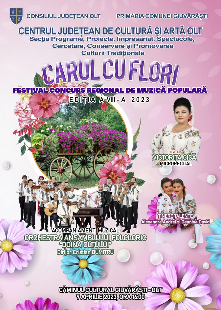 Consiliul Județean Olt, Centrul Județean de Cultură și Artă Olt, prin Secția Programe, Proiecte, Impresariat, Spectacole, Cercetare, Conservarea și Promovarea Culturii Tradiționale, Primaria și Consiliul Local Giuvărăști organizează anul acesta o nouă ediție a Festivalului concurs regional de muzică populară „Carul cu flori”. Evenimentul cultural a ajuns la cea de-a opta ediție și se va desfășura așa cum se întâmplă anual, în ziua de Florii, care în 2023 pică pe 9 aprilie.