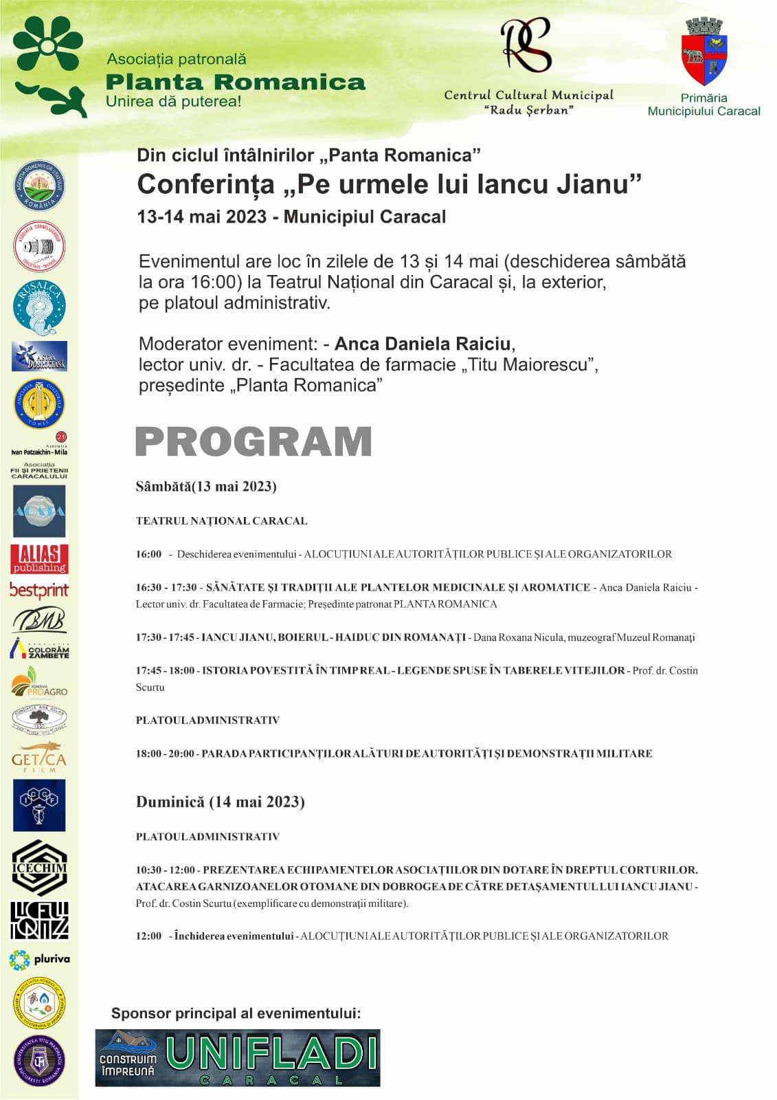 „Pe 13 mai, cu începere de la ora 16:00, la Teatrul Național din Caracal ne întâlnim cu invitați speciali: muzeograf Dana Roxana Nicula, din cadrul Muzeului Romanați, profesor doctor Costin Scurtu și președintele „Planta Romanica”, doamna Anca Daniela Raiciu. Pe 14 mai, pe platoul din fața Primăriei, vom fi martorii unei coregrafii speciale cu demonstrații militare legate de atacarea unei garnizoane otomane de către trupele conduse de Iancu Jianu. Vom admira împreună costumele și uniformele acelor vremuri și vom lua parte la rememorarea unei file din istoria zbuciumată a eroului nostru local Iancu Jianu. Vă așteptăm cu drag!”, este invitația adresată de municipalitatea caracaleană.