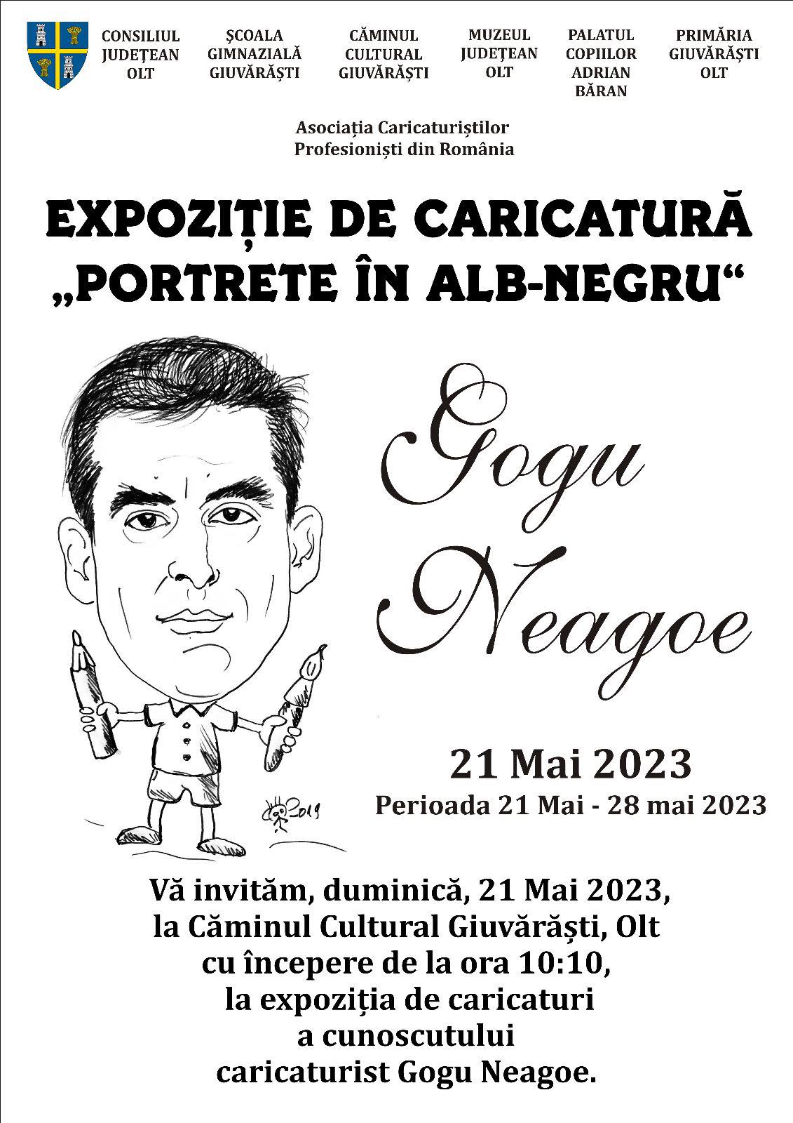 S-a bucurat de succes la Osica de Jos, comuna sa natală, iar acum are pregătită o nouă expoziție în mediul rural. Este vorba despre caricaturistul oltean Gogu Neagoe care va fi prezent în comuna Giuvărăști, când aici va avea loc o mare sărbătoare cu ocazia Sfinților Împărați Constantin și Elena. Căminul Cultural din localitate va fi gazdă a expoziției „Portrete în Alb și Negru”, semnată Gogu Neagoe, evenimentul fiind deschis în cadrul instituției culturale la ora 10:10 cu primirea oficialităților, invitaților, dar și a simplilor cetățeni din Giuvărăști.