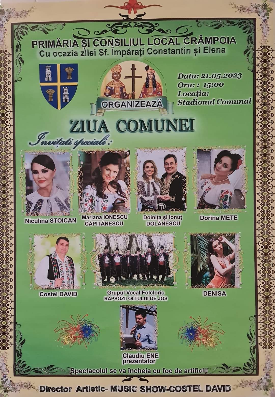Sărbătoare mare de Sfinții Împărați Constantin și Elena în comuna Crâmpoia. Ionel Mirea, primarul localității, împreună cu echipa sa de consilieri locali și angajații din Primărie, au pregătit un spectacol extraordinar în cadrul căruia vor susține recitaluri îndrăgiți interpreți de muzică populară, cap de afiș fiind Ionuț și Doinița Dolănescu (FOTO), Niculina Stoican și Mariana Ionescu Căpitănescu.