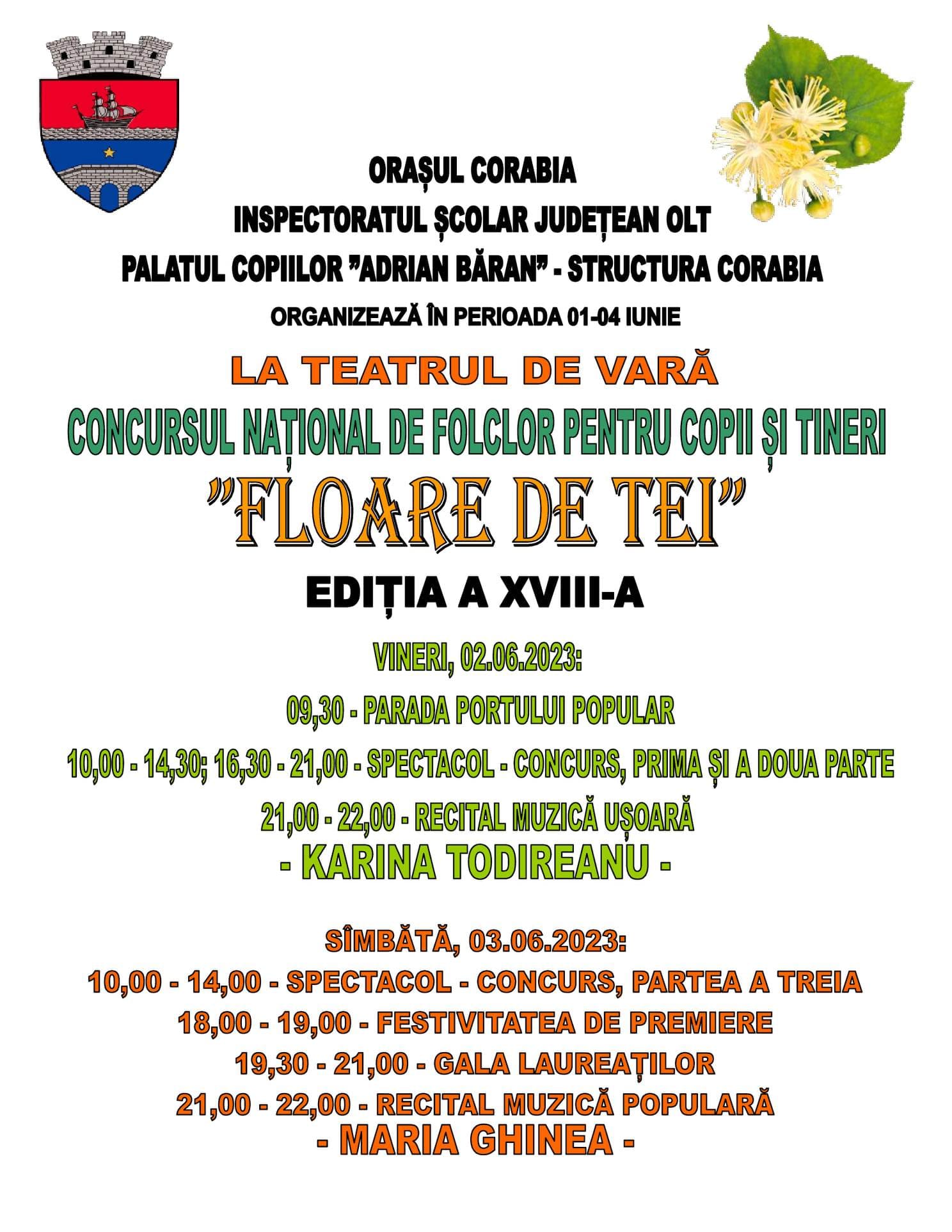 Primăria și Consiliul Local Corabia, în colaborare cu Inspectoratul Școlar Județean Olt, prin Structura Corabia a Palatului Copiilor „Adrian Băran”, organizează la sfârșitul săptămânii viitoare o nouă ediție a Concursului Național de Folclor pentru Copii și Tineri „Floare de tei”. Este ediția a XVIII-a, majoratul, a unui eveniment care se va desfășura pe parcursul a două zile, respectiv 3 și 4 iunie, la Teatrul de Vară din orașul de la malul Fluviului Dunărea.