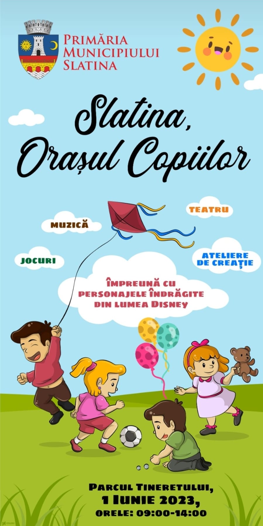 Municipalitatea slătineană a pregătit nu mai puțin de 21 de ateliere de activități dedicate celor mici, acestea desfășurându-se pe 1 Iunie, de Ziua Copilului, în Parcul Tineretului. Evenimentul „Slatina, orașul copiilor” va avea loc pe parcursul a cinci ore, începând cu ora 09:00, iar în cadrul acestuia prichindeii se vor bucura nu doar de ateliere, ci și de muzică, teatru și jocuri, alături de ei fiind, bineînțeles, și personaje îndrăgite din lumea Disney.
