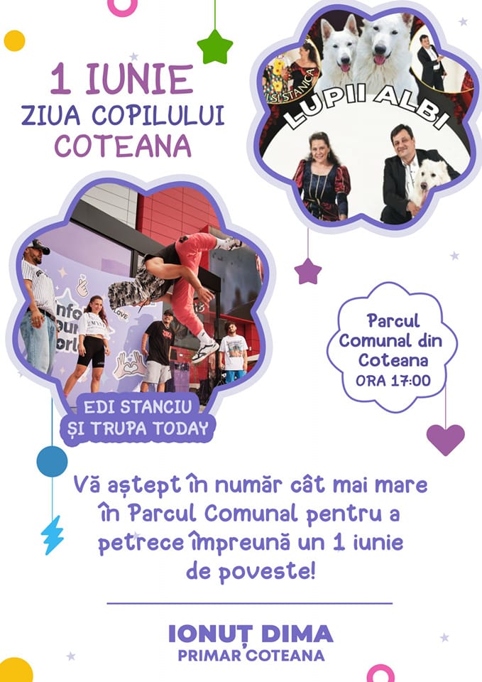 Primăria și Consiliul Local Coteana, în frunte cu primarul Ionuț Dima, au pregătit surprize pentru prichindei de 1 Iunie – Ziua Internațională a Copilului. Parcul Comunal din localitate va fi locația în care, începând cu ora 17:00, se va desfășura un spectacol cu Lupii albi, dar și cu Edi Stanciu și Trupa Today.