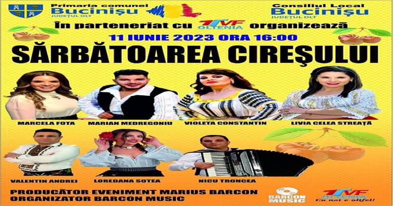 Sărbătoare mare în acest sfârșit de săptămână în comuna olteană Bucinișu. Primăria și Consiliul Local, în frunte cu primarul Radu Miltiade, dar și în parteneriat cu TVF Oltenia și Barcon Music, organizează o nouă ediție a „Sărbătorii Cireșului”, evnimentul cultural artistic urmând a se desfășura în centrul localității. Pe scena special amenajată aici vor urca artiști de seamă ai muzicii populare românești, cap de afiș fiind îndrăgiții interpreți Marcela Fota și Marian Medregoniu (FOTO – Facebook Marian Medregoniu Oficial).