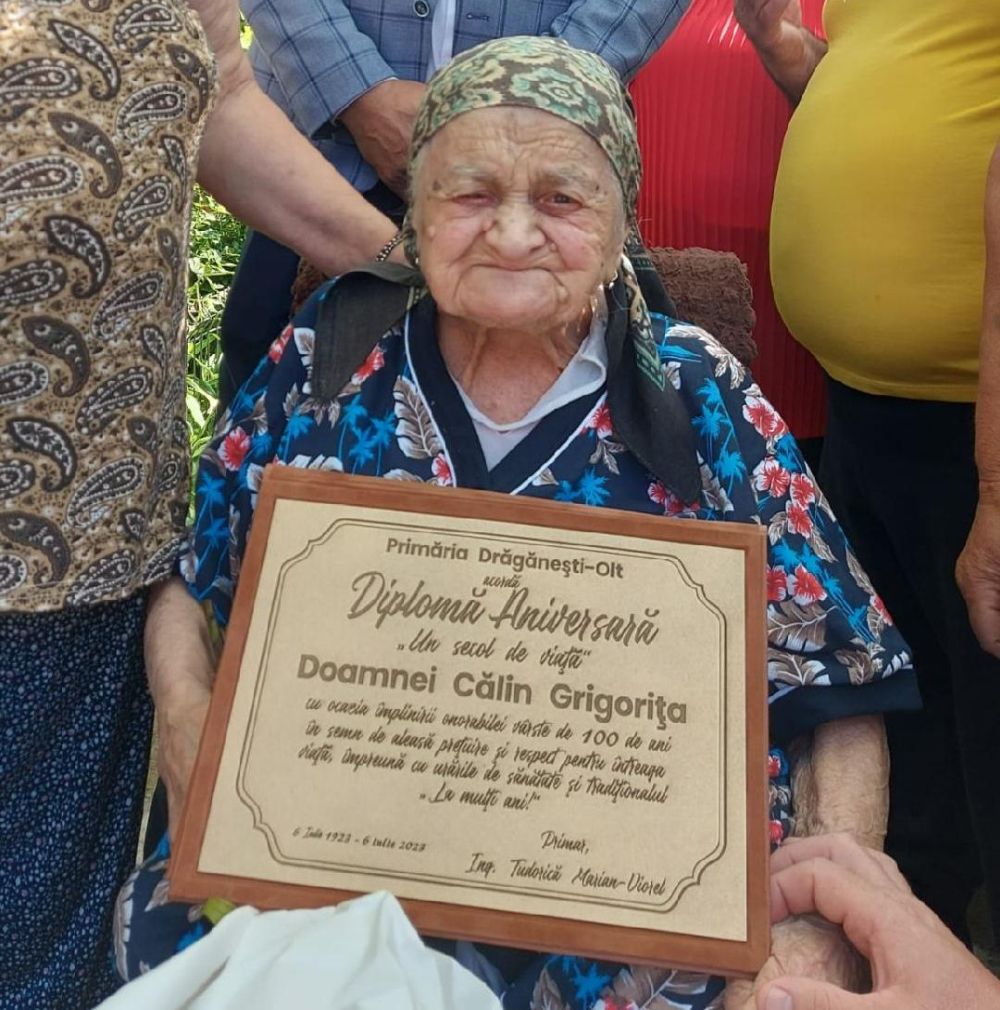 „Un secol de viață! Doamna Călin Grigorița a împlit 100 de ani! A fost vizitată acasă de domnul primar și alți reprezentanți ai primăriei, pentru a-i face cadou un tort, un buchet de flori, o plachetă personalizată și un premiu aniversar în valoare de 5.000 lei și pentru a-i ura tradiționalul «La mulți ani!» din partea întregii suflări a localității. Împreună cu toți locuitorii orașului nostru, îi dorim doamnei Grigorița multă sănătate și bucurii, alături de familie și cei dragi!”, este mesajul pe care administrația locală l-a postat la zi de sărbătoare pentru tanti Grigorița pe pagina oficială de Facebook a Primăriei Drăgănești Olt.