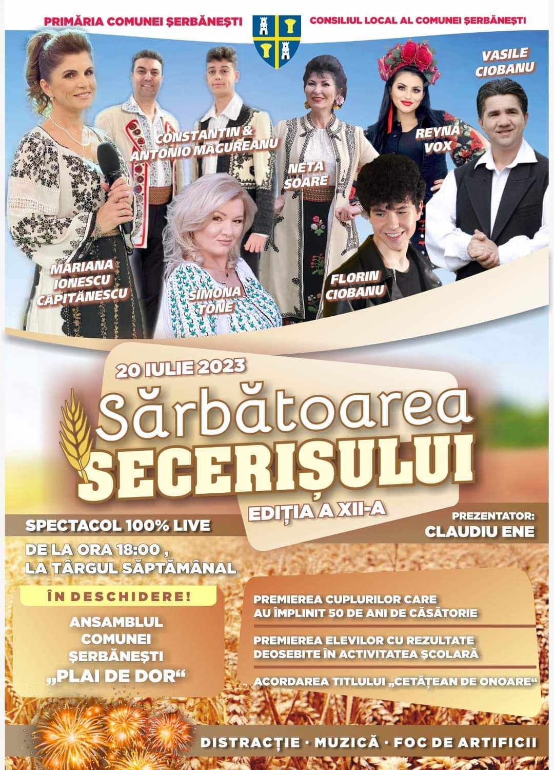 Sărbătoare mare pe 20 iulie, de Sfântul Prooroc Ilie, în comuna Șerbănești. Dacă sărbătoriții zile vor petrece de onomastica lor, ceilalți cetățeni ai localității sunt așteptați la o nouă ediție a Sărbătorii Secerișului. Este cea de-a XII-a ediție și, începând cu ora 18:00, aceasta se va desfășura la Târgul Săptămânal din comună. Vor fi într-un spectacol extraordinar îndrăgiți interpreți ai muzicii populare românești, cap de afiș fiind Mariana Ionescu Căpitănăescu (FOTO), Neta Soare, Constantin Măgureanu și Vasile Ciobanu.