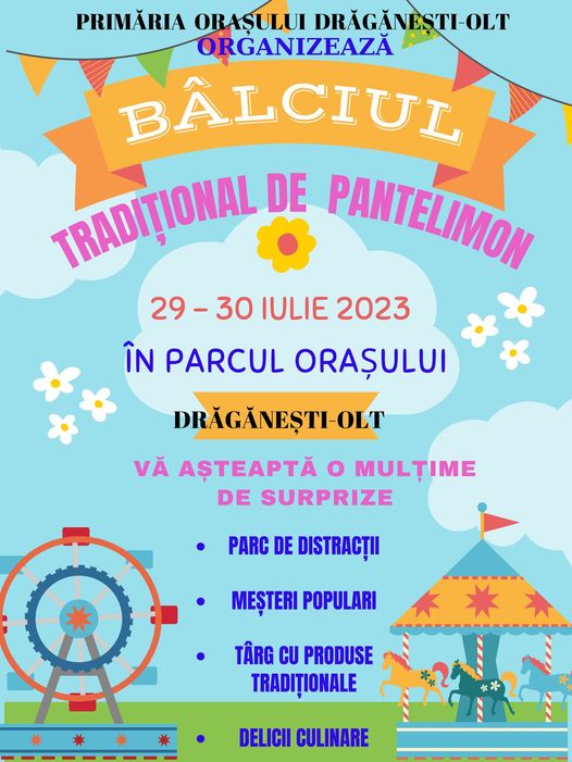 Mare sărbătoare în acest sfârșit de săptămână, în orașul Drăgănești Olt. Primăria și Consiliul Local, în frunte cu primarul Marian Viorel Tudorică, organizează Bâlciul tradițional de Pantelimon, manifestarea desfășurându-se în Parcul localității.