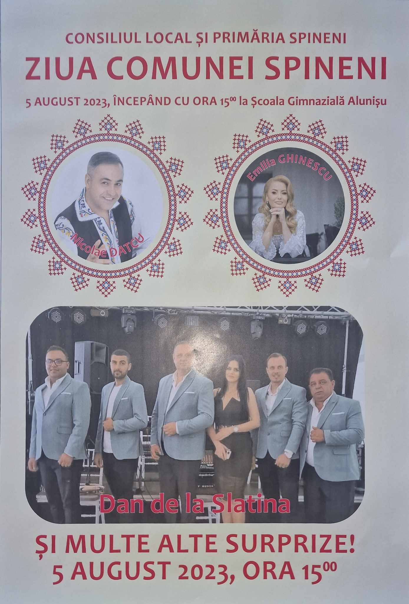 Școala Generală Alunișu din comuna Spineni este locația în care sâmbătă, 5 august 2023, va avea loc a șaptea ediție a Zilei localității. Primăria și Consiliul Local Spineni, în frunte cu edilul Dănuț Șărpău, au pregătit multe surprize pentru cei care vor fi prezenți la spectacolul folcloric care îi are cap de afiș pe îndrăgiții artiști Emilia Ghinescu (FOTO) și Nicolae Datcu.