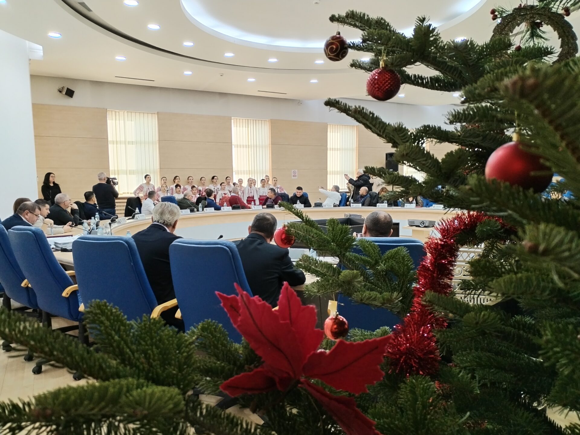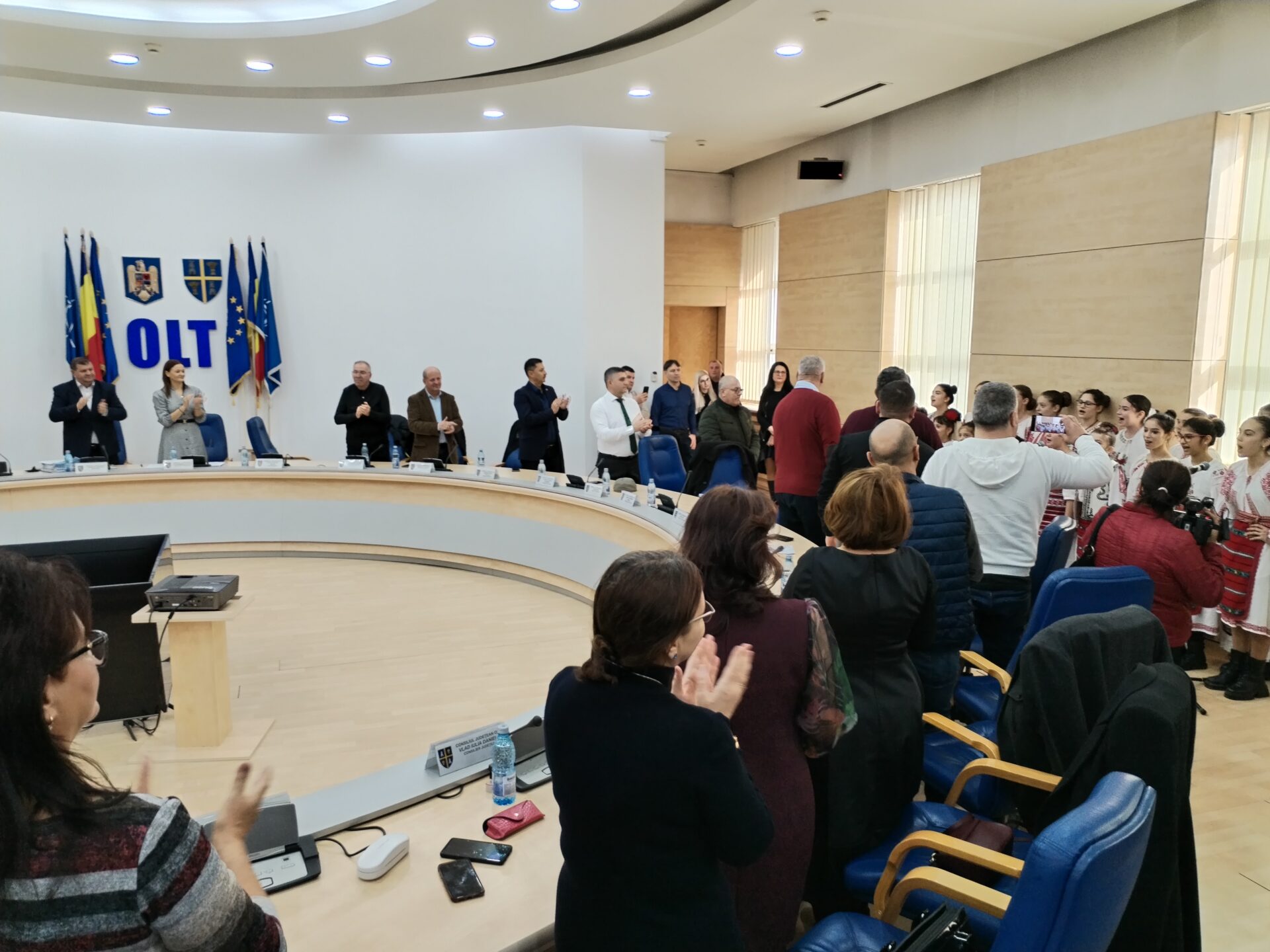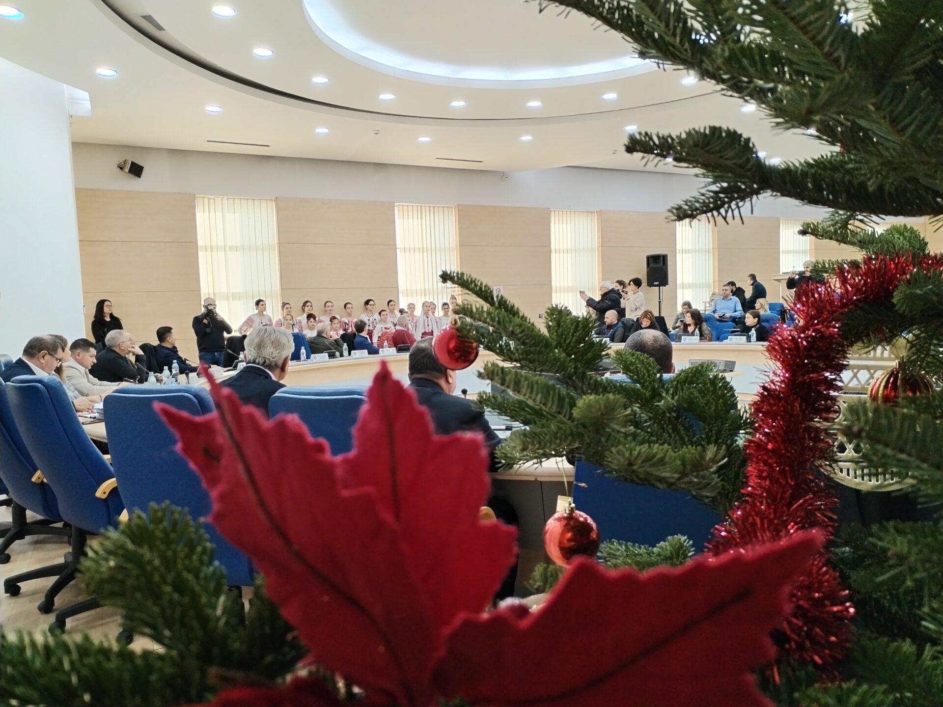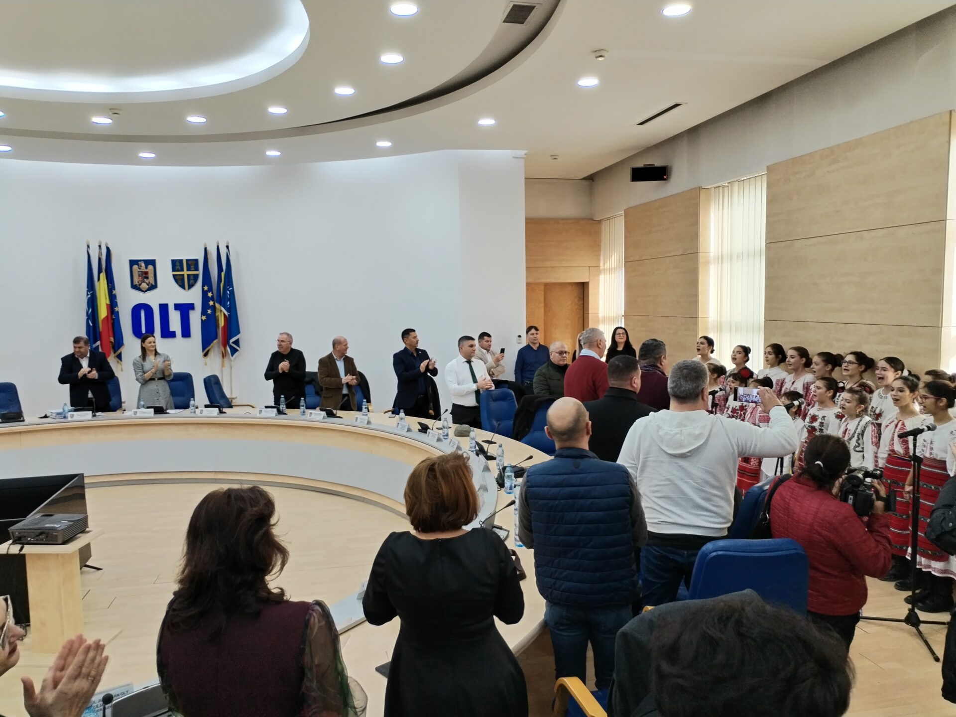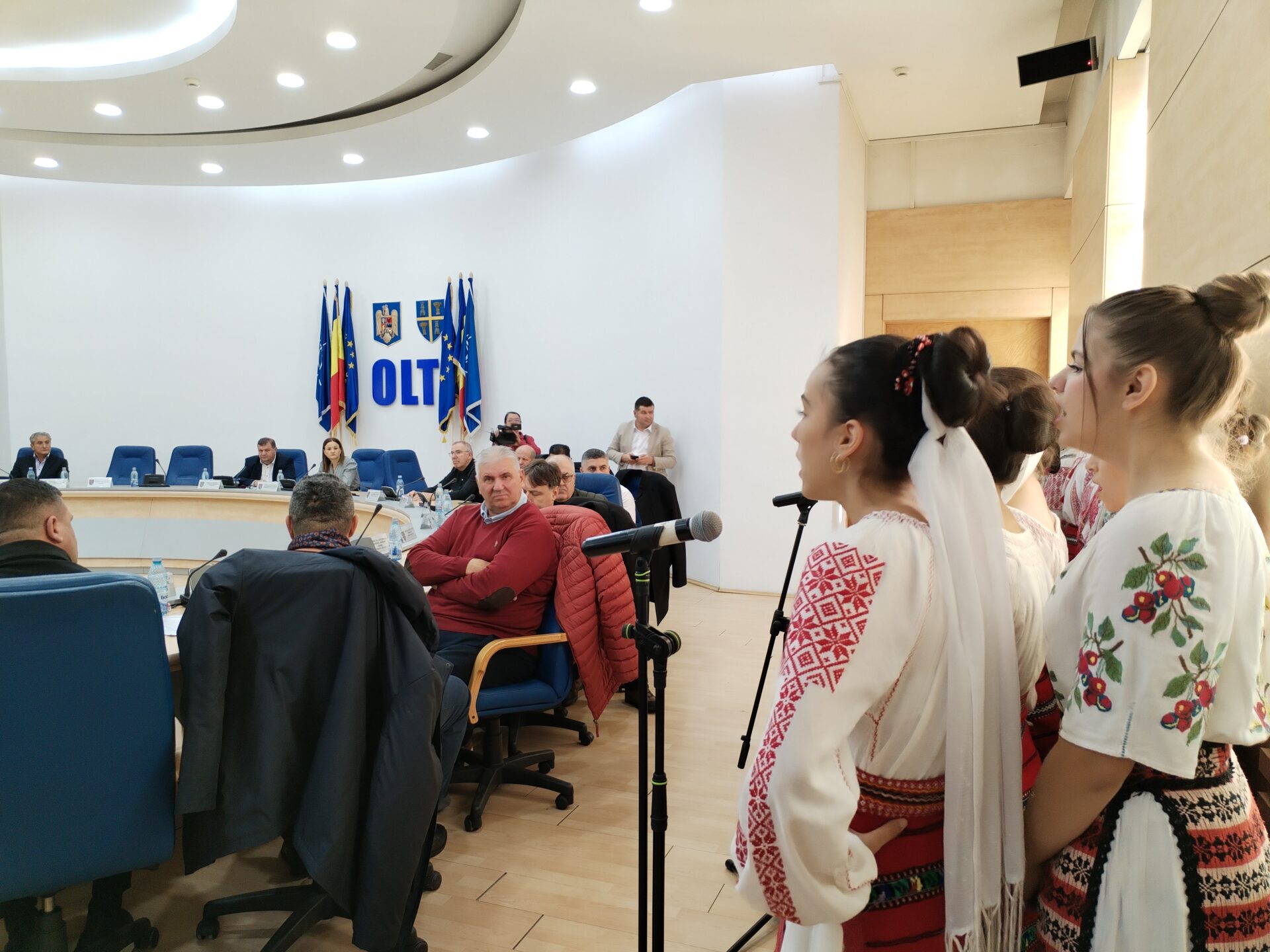 Copiii clasei de canto popular din Osica de Sus a Secției Arte și Meșteșuguri din cadrul Centrului Județean de Cultură și Artă Olt au prezentat un scurt program artistic live de colinde autentice. La final, momentul oferit de colindători a fost îndelung aplaudat de cei doi vicepreședinți ai celei mai importante instituții administrative din județ, Virgil Delureanu și Ionuț Ivan, cât și de consilierii județeni prezenți în Sala Europa a CJ.