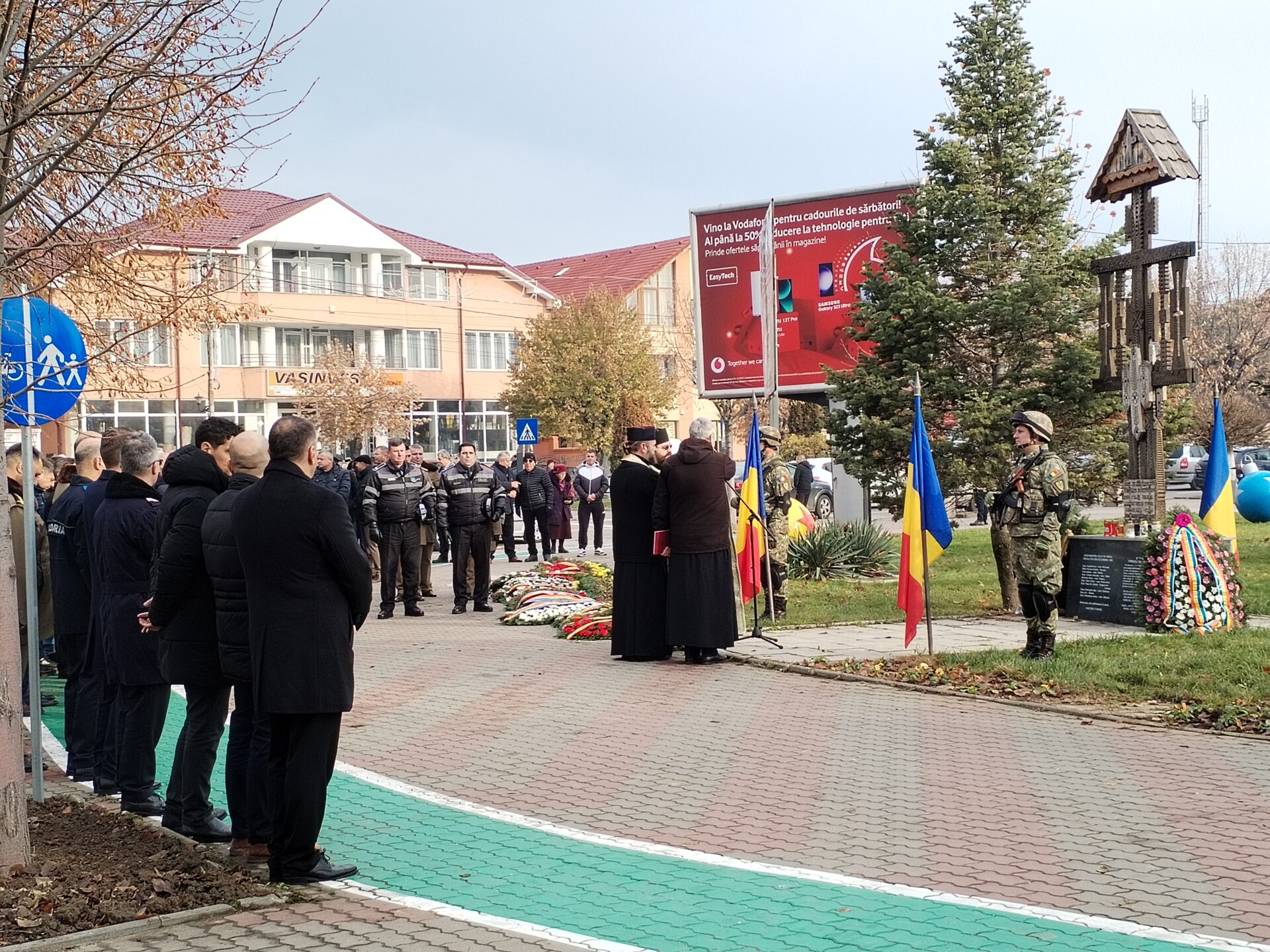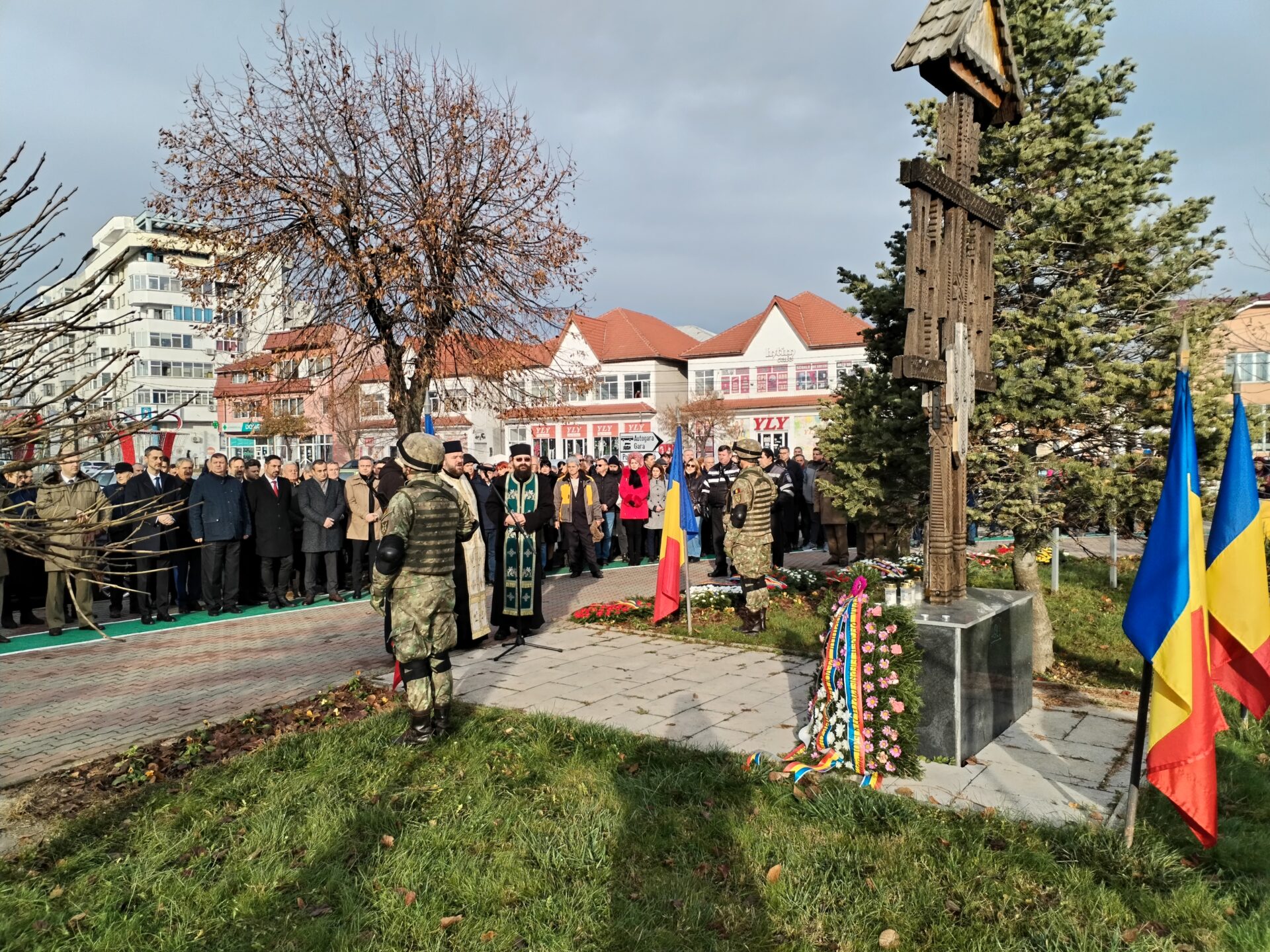 După salutul prefectului județului dat gărzii de onoare și interpretarea imnului de stat al României de fanfara de estradă Lyra Band a Primăriei Slatina, un sobor de preoți de la Episcopia Slatinei și Romanaților au ținut o scurtă slujbă de cinstire a martirilor Revoluției din județ, momentul fiind urmat de o alocuțiune despre semnificația acestui eveniment rostită de reprezentantul instituției Guvernului din teritoriu. Pe imnul Eroilor, manifestarea a continuat cu depunerea de coroane de flori la troiță, dar și defilarea gărzii de onoare și cu atunci când oficialităţile au depus la Troiţa Eroilor coroane de flori pentru a-i omagia pe martirii din revoluţiei din Decembrie ’89. Atunci, potrivit datelor de pe placa comemorativă a troiţei, au murit pentru libertatea acestei ţări şi 11 olteni, respectiv sublocotenent Ion Argherie din Rotunda, maior Andrei Burcea din Caracal, Adrian Călin din Vlădila, sublocotenent Nicolae Ciobanu din Tufeni, Silviu Motohan din Traian, sublocotenent Victor Olaru din Pârşcoveni, sublocotenent Daniel Gh. Popa din Comani – Drăgăneşti Olt, Gheorghe Ioan Radu din Slătioara, Ion Sasu din Slatina, sublocotenent Iancu Sîrbulescu din Obârşia şi Doru Surghe din Vişina.