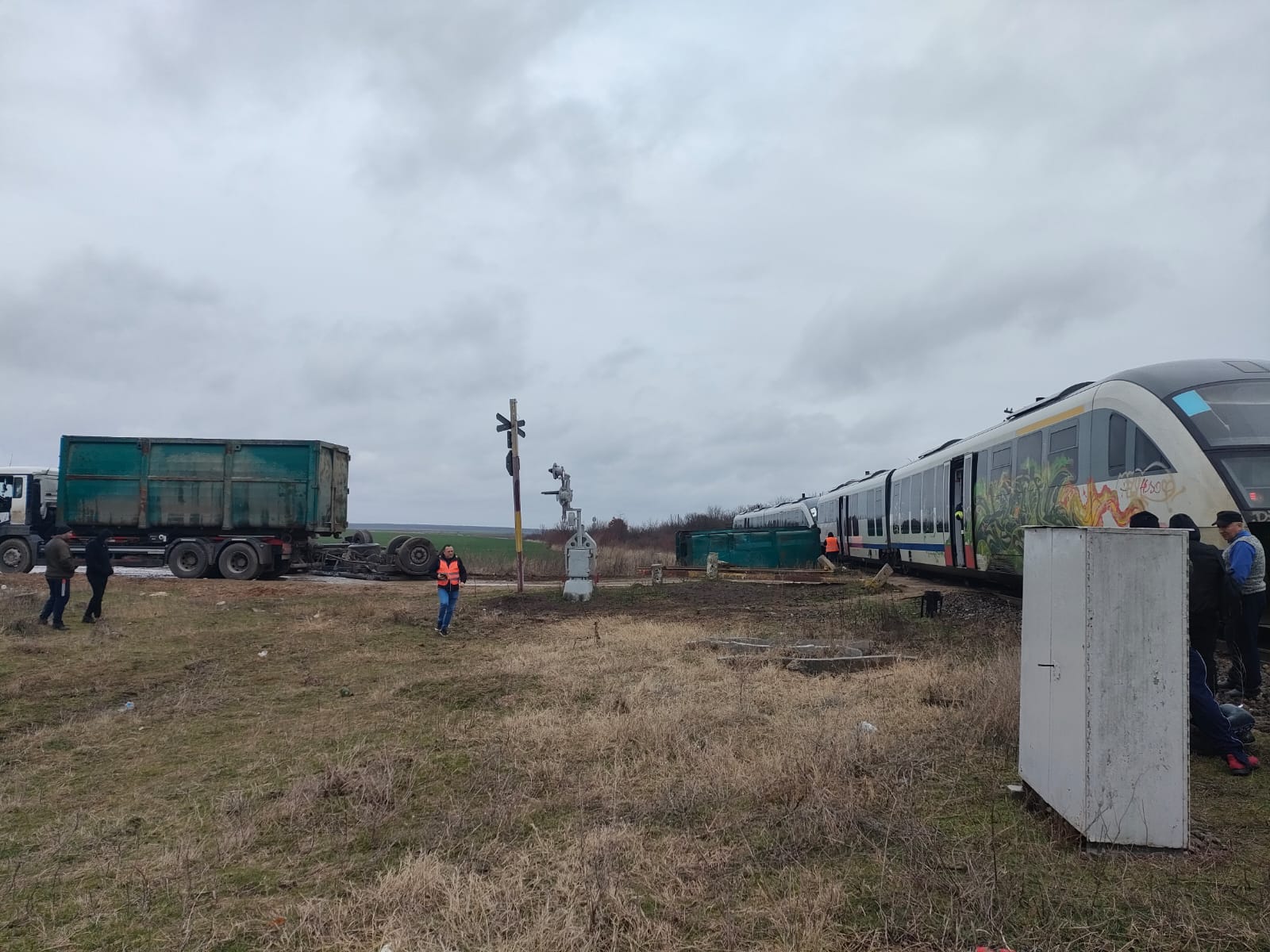Articolul inițial: Ca urmare a neasigurării unui conducător auto la o trecere la nivel cu calea ferată, situată la ieșirea din stația de cale ferată Bălteni, din județul Olt, marți, 13 februarie 2024, în jurul orei 13:30, s-a produs lovirea uneia dintre cele două remorci ale unui camion de transport gunoi de trenul Regio 9266, anunță reprezentanții Companiei Naţională de Căi Ferate CFR SA. Mecanicul de locomotivă a fost rănit în urma coliziunii violente, iar o femeie a suferit un atac de panică.