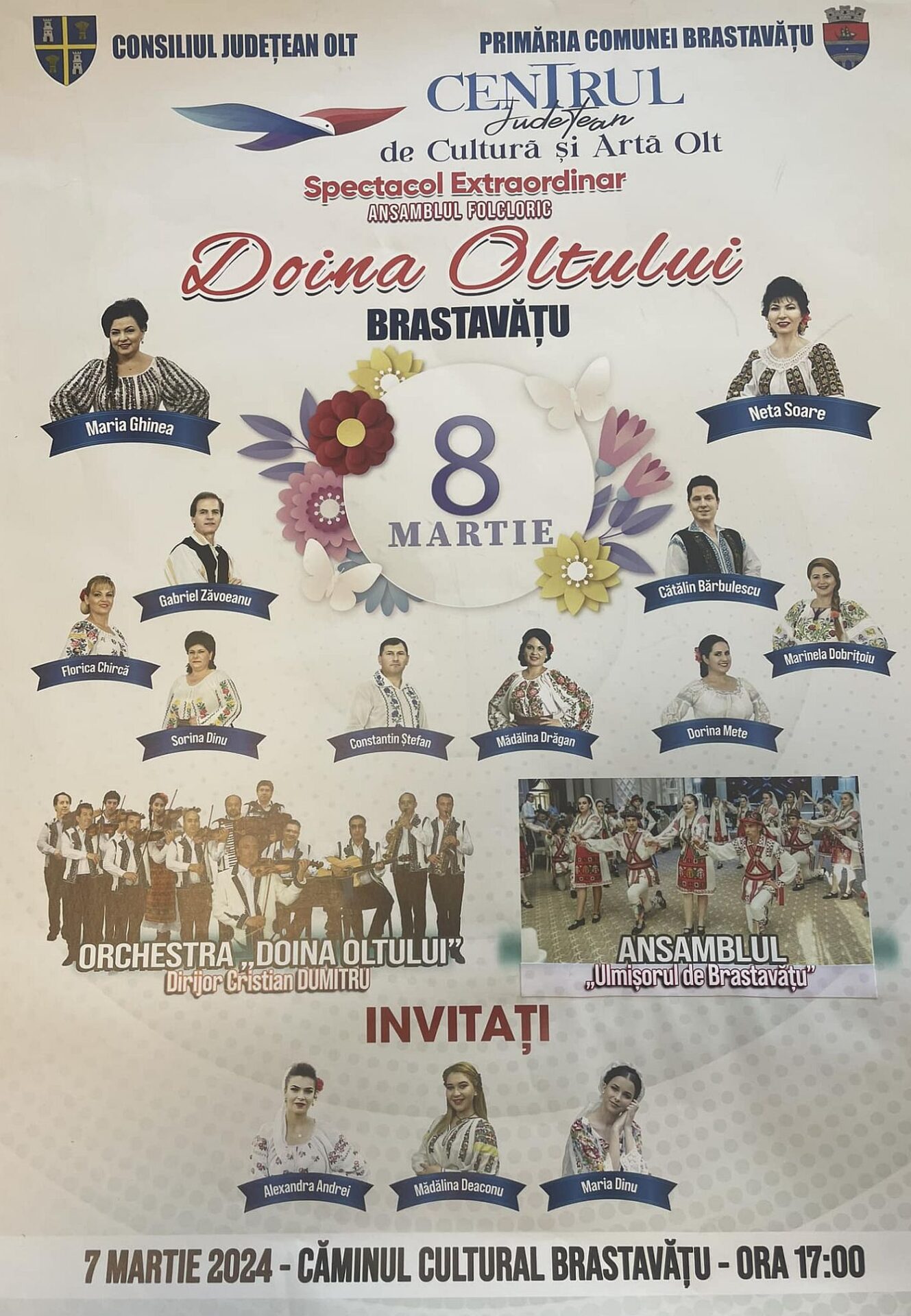 În acest sfârșit de săptămână, Ansamblul Profesionist „Doina Oltului” din municipiul Slatina care funcționează în cadrul Centrului Județean de Cultură și Artă Olt, instituție aflată în subordinea Consiliului Județean Olt, va susține mai multe spectacole extraordinare, acestea fiind dedicate zilei de 8 Martie, Ziua Femeii.