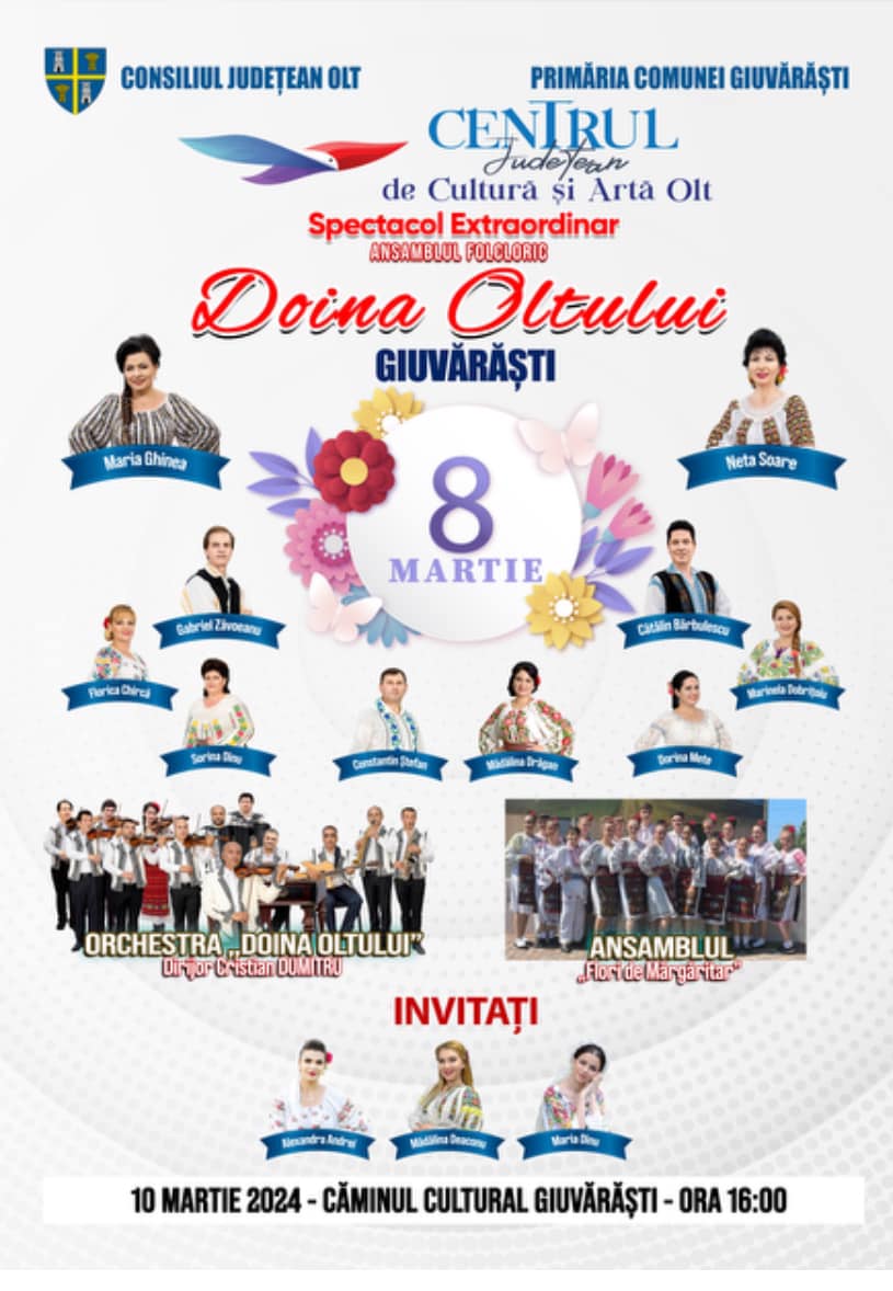 Și doamnele și domnișoarele din Giuvărăști, dar și domnii, sunt invitate la spectacolul „Doina Oltului” din ziua de duminică, 10 martie 2024, care se va desfășura la Căminul Cultural din localitate. Ansamblul „Flori de Mărgaritar” din localitate va evolua și el pe scenă.