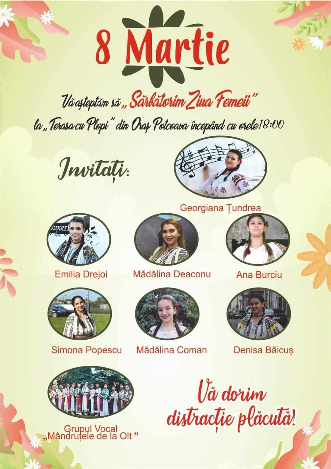 „Mama, bunica, soacra… Femeia. Mândruțele vă invită cu mic, cu mare, vineri, 8 Martie, în orașul Potcoava, la «Terasa cu plopi», ora 18:00. Sărbătorim ființa cea mai dragă! Felicitări și mulțumiri familiei Nicu Tundrea, pentru organizare și invitație! Vă așteptăm cu mare drag!”, au anunțat artistele Grupului „Mândruțele de la Olt”.