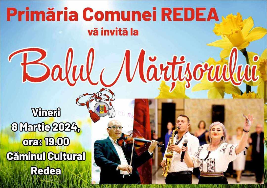 „Stimate doamne și domnișoare! Cu ocazia celei mai deosebite zi din an sărbătorită în cinstea tuturor doamnelor și domnișoarelor, Primăria Redea, împreună cu primarul Dan Bălă și Consiliul Local, vă așteaptă la Balul Mărțișorului, în data de 8 Martie 2024, începând cu ora 19:00. În seara evenimentului, ne vor fi alături, ca de fiecare dată, dirijorul Cristi Dumitru, alături de îndrăgita Alina Stănuț și saxofonistul Marius Zaharia. Vă așteptăm și cu multe alte surprize! La mulți ani tuturor femeilor!”, au transmis autoritățile locale.