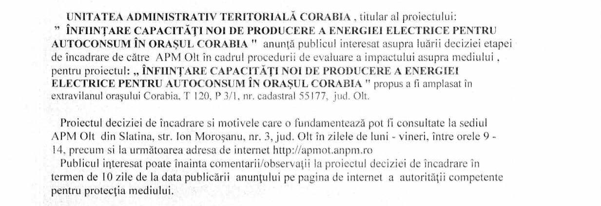 Anunț public privind decizia etapei de încadrare