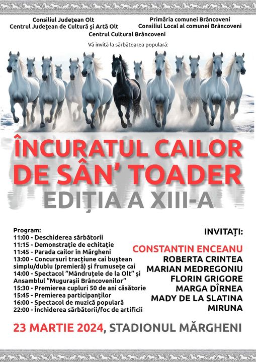 Sâmbătă, 23 martie, în organizarea Primăriei Brâncoveni, stadionul din satul Mărgheni al comunei oltene va găzdui ediția cu numărul 13 sărbătorii, devenită tradiție, „Încuratul cailor de Sân’ Toader”. Sunt așteptați zeci de concurenți din Brâncoveni, localități învecinate, dar și din alte localități ale județului Olt și din alte județe ale țării, aceștia participând la probele de frumusețe și tracțiune buștean.