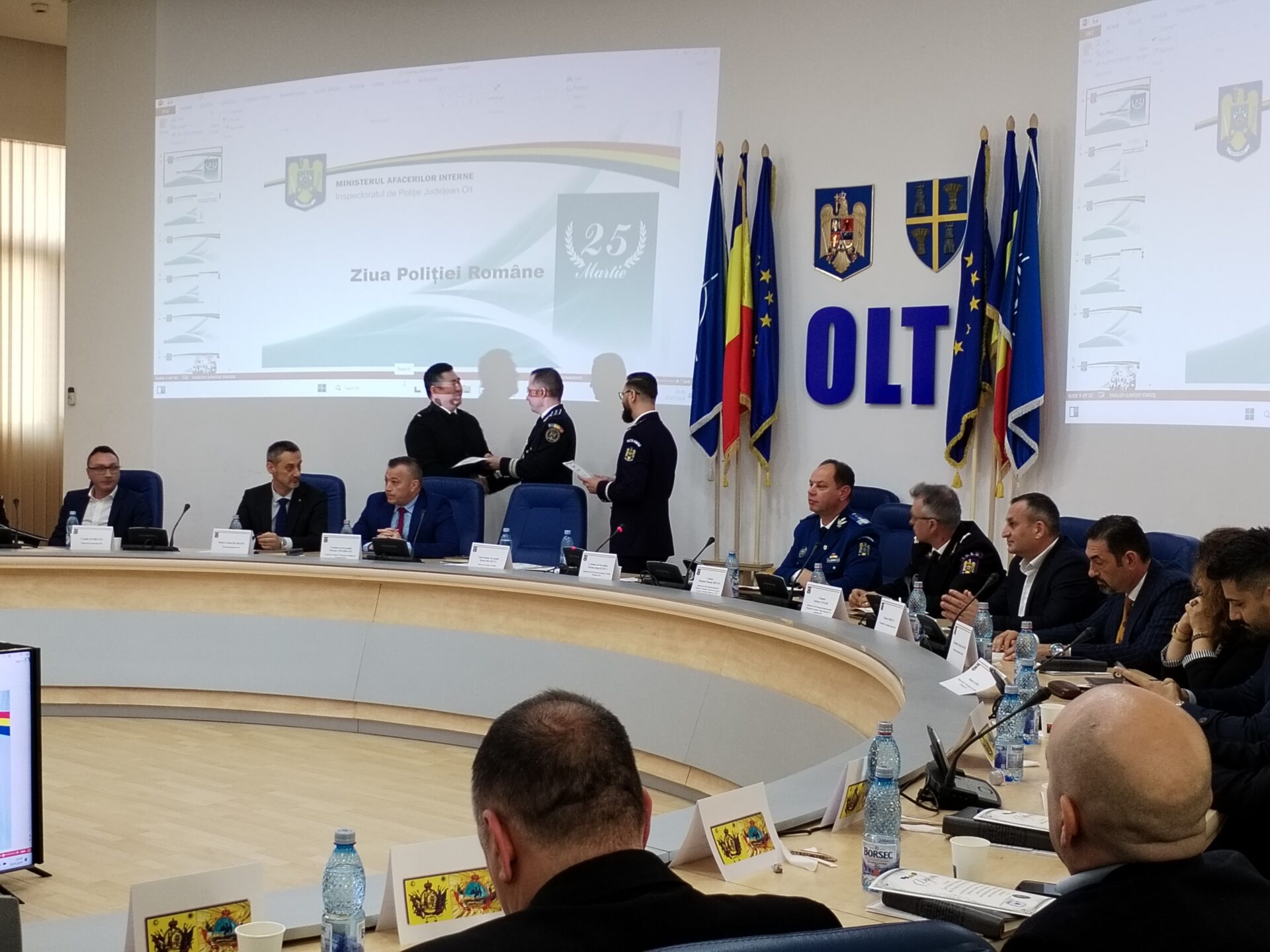 Inspectoratul de Poliție Județean Olt a marcat luni, 25 martie, de Buna Vestire, împlinirea a 202 de ani de existență a Poliției Române într-un cadru festiv. Sala Europa a Consiliului Județean Olt a găzduit una dintre manifestările dedicate Zilei Poliției Române, iar în cadrul acesteia peste 140 de agenți și ofițeri de poliție au fost avansați în grad la termen sau înainte de termen.