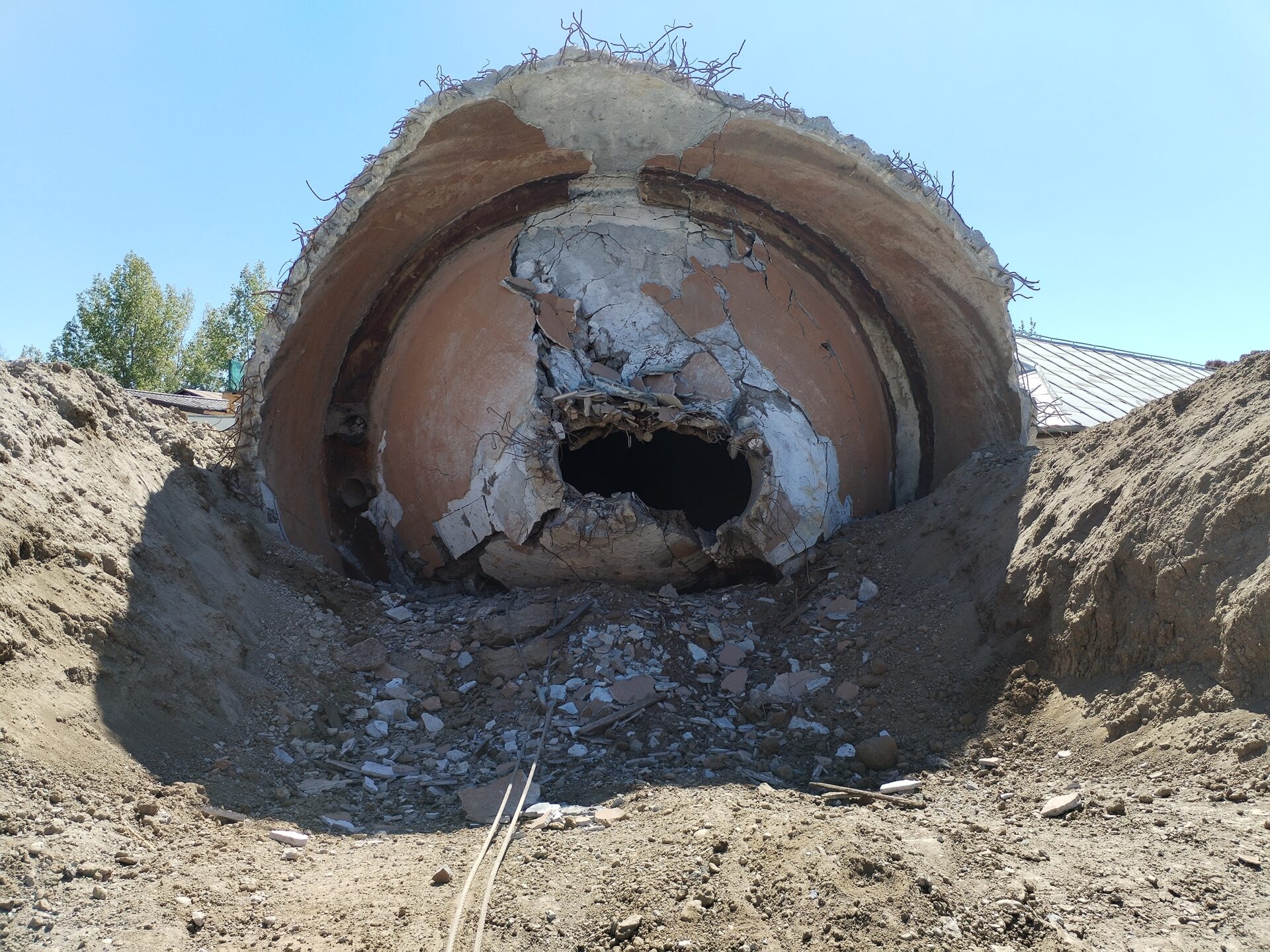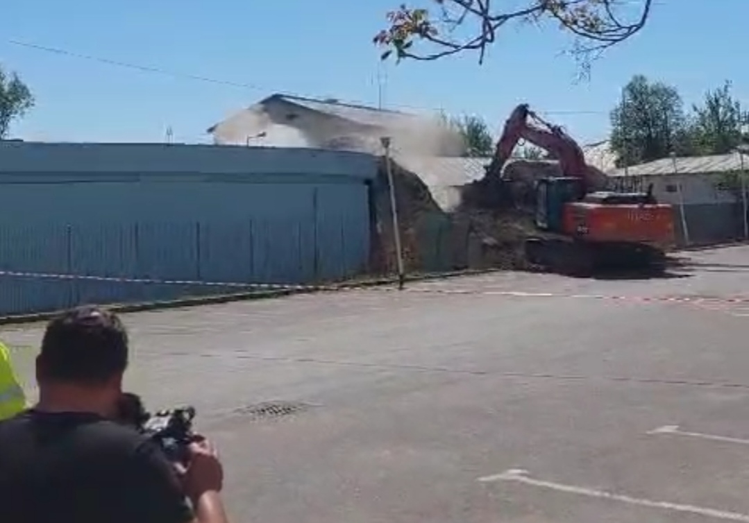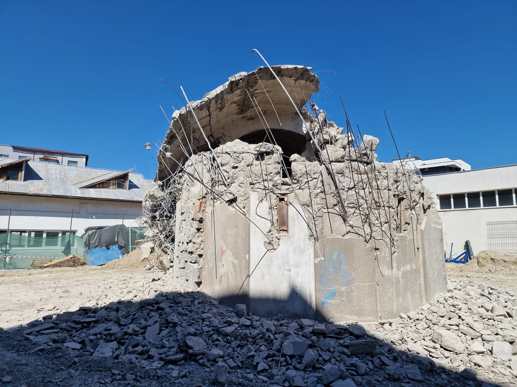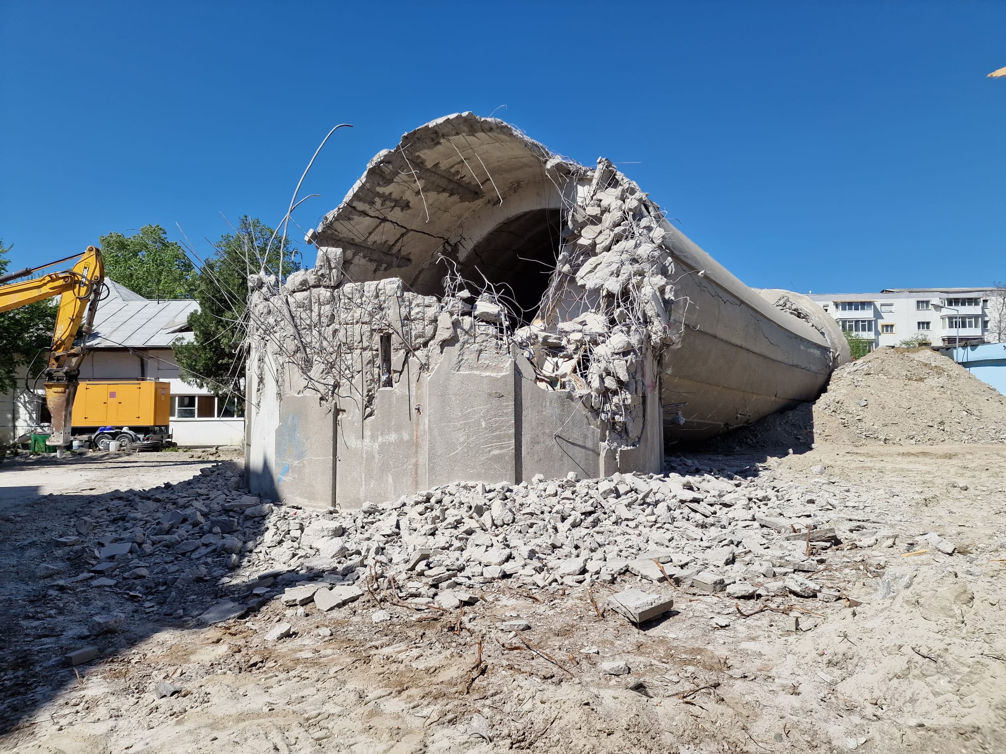 Ancorat bine, turnul de apă, care avea o înălțime de 38 de metri, a fost doborât cu ajutorul a două utilaje. Dacă unul a acționat la temelie, celălalt l-a tras controlat în momentul în care s-a putut.
