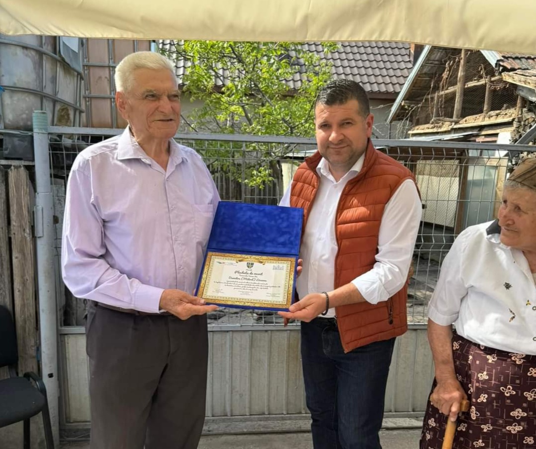 Iar autoritățile i-au oferit meșterului cojocar de la Vădastra, un adevărat tezaur uman viu, plachetă de onoare, tort, șampanie și flori.