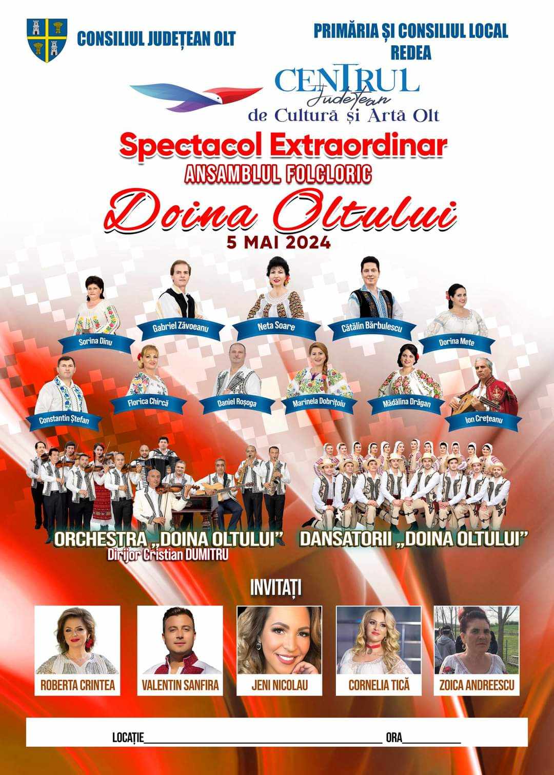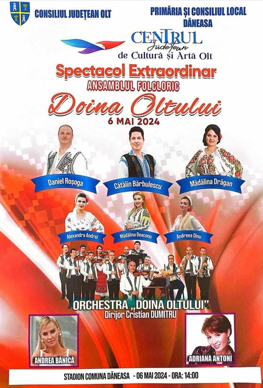 La Dăneasa, „Doina Oltului” va fi în spectacol în cea de-a doua zi de Paște, cu începere de la ora 14:00, pe stadionul comunal. Vor susține recitaluri Daniel Roșoga, Cătălin Bărbulescu, Mădălina Drăgan, Alexandra Andrei, Mădălina Deaconu și Andreea Dinu, acompaniamentul muzical fiind asigurat de orchestra ansamblului de la Slatina, iar invitați speciali sunt Andriana Antoni și Andreea Bănică.