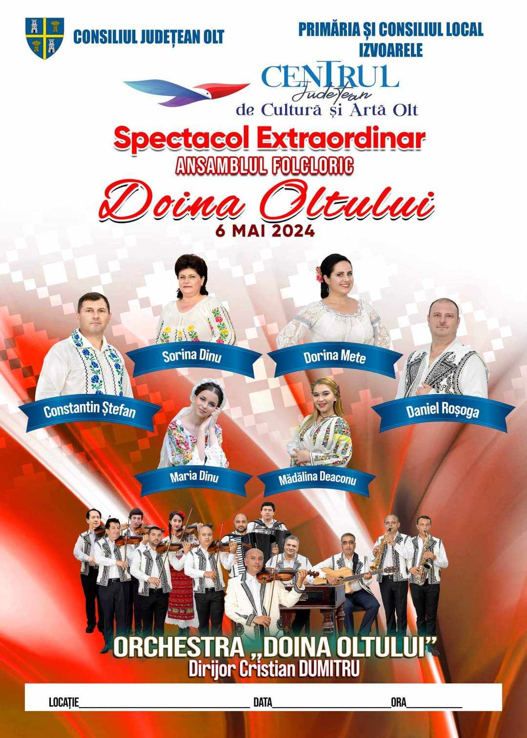 Tot luni, 6 mai, va fi spectacol extraordinar „Doina Oltului” și în comuna Izvoarele, de la ora 16:00, în satul Alimănești. Aici, în recital, vor fi Sorina Dinu, Dorina Mete, Constantin Ștefan, Daniel Roșoga, Maria Dinu și Mădălina Deaconu, acompaniamentul muzical fiind asigurat tot de orchestra condusă de violonistul Cristian Dumitru.